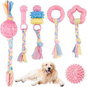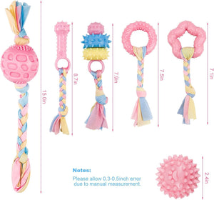 6 PCS DOG CHEW TOYS BUNDLE: The puppy chew toys pack including a pea pods,a chewing ball, 4 chew toys pack with soft braided fabric cloth.All in pretty pastel pink toy theme.Perfectly pink for the girls.The bright pink color makes them easy to find even under a chair. If you are not sure what your puppy is into or likes to play with,just try these on.Since 6 different shapes of dog chewing toys bring different happy experiences to dogs and meet the various chewing needs of puppies