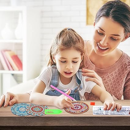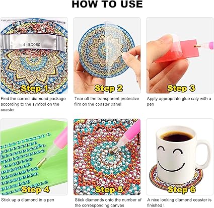 ►【Easy to DIY for Beginners&Kids】Pour your the diamonds that corresponds to the number on the coaster into the tray, then peel off the film covering the coaster, insert the diamond painting pen into the solid glue, glue the appropriate amount of solid glue, stick the corresponding diamonds on the coaster according to the number on the coaster. A unique and beautiful mandala coaster is done.