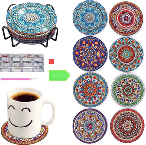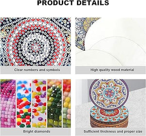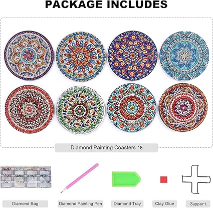 ►【Package Include】You will get 8 pieces diamond painting coasters in different mandala themed, 1 pieces enough colorful diamonds set, 1 pieces clay glue, 1 pieces diamond painting pen, 1 pieces diamond tray, contains all the accessories and tools you need for DIY diamond painting coasters.