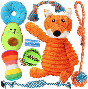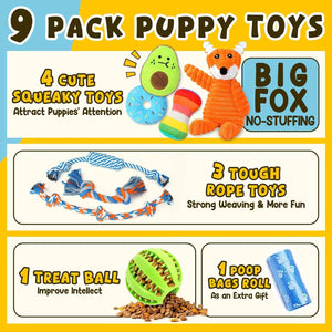 đ¶ăDog Toys & Super Fună: 9 Packs cute puppy toys for puppy and small dogs. Including 4 squeaky plush toys, 3 tough rope toys, 1 treat ball, extra poop bag rolls as a gift. Great size for small puppy. More dog toys keep your friend more playtime, more fun, stay happy and healthy.