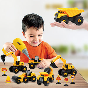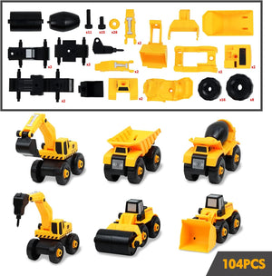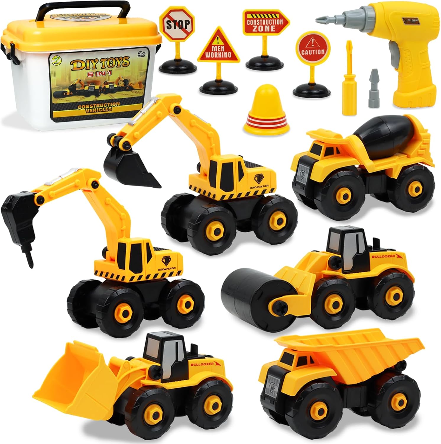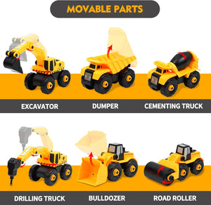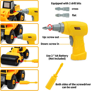 【Take Apart Car Toy Set】The 6-in-1 STEM construction vehicle kit consists of an excavator, dumper, bulldozer, cement truck, drill truck, road roller, a screwdriver, an electric drill, some traffic signs and equipped with assembly instructions. Meet the needs of multiple children to play together.