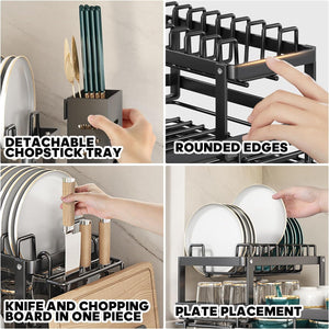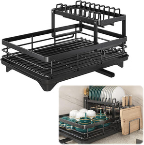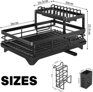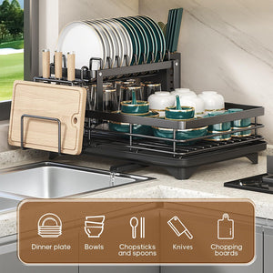 3. Smart Storage and organization: This double-deck dish holder can easily solve your kitchen organization problems. It comes with a drain tray to effectively store and drain dishes, making your kitchen more organized. At the same time, it can also be placed under the sink to make full use of space and make your kitchen more spacious. 1 tool holder and plate holder. 1 cutlery rack.