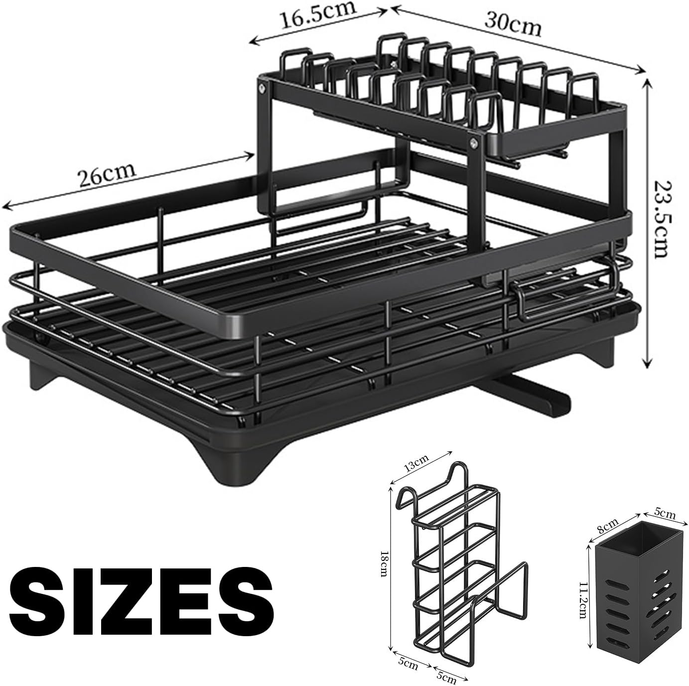 1. Multi-functional design: This dish drying rack dish holder not only contains a cutlery holder and cutting board holder, but also has a 360-degree drain design that allows water to flow smoothly to the lower drain. Its drainpipe is retractable and can be adjusted according to needs, which is very convenient and practical. Double height 30*42.5*24cm, single height, 30*42.5*13.5cm,