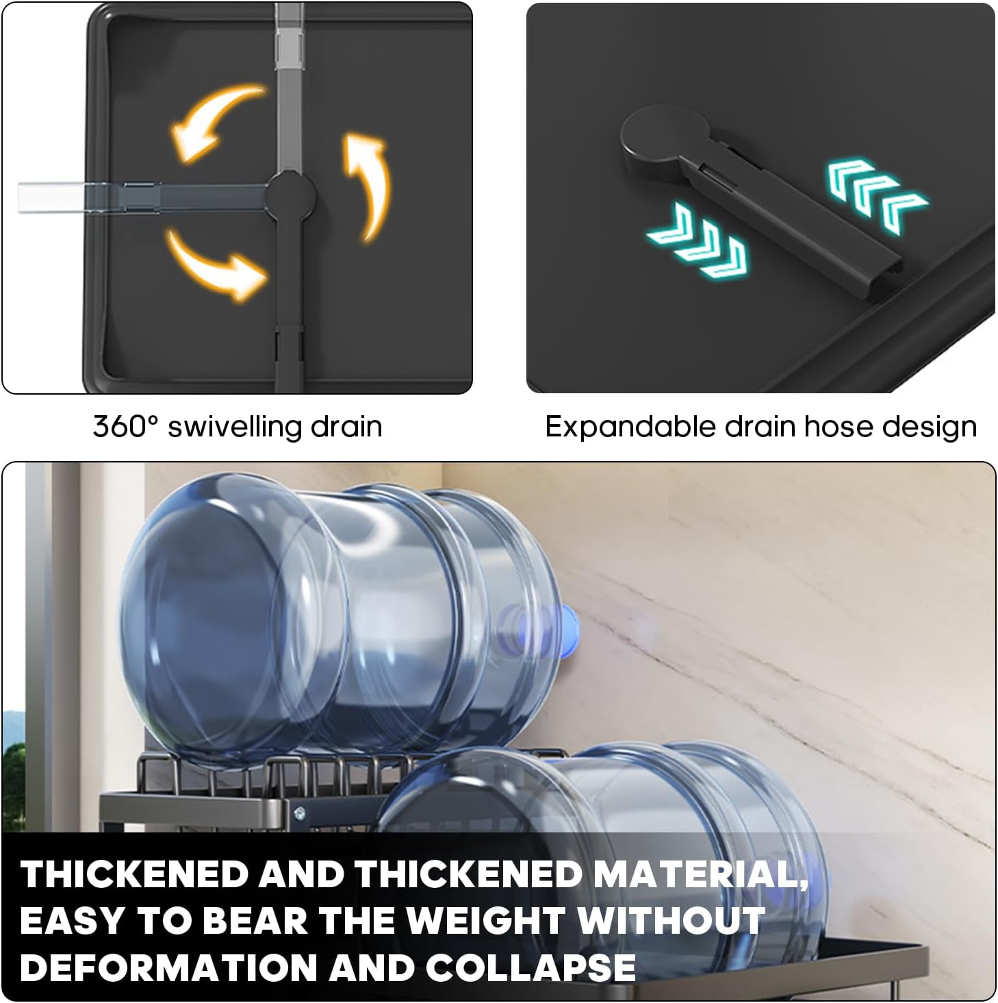 2. Moisture-proof and rust-proof material: dish rack Even if it is exposed to moisture for a long time, it can maintain stable quality and is not easy to rust, so that your kitchen is clean and dry. The drainage outlet is adjusted 360 degrees, and the drainage pipe is retractable.