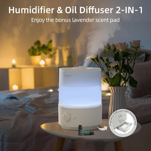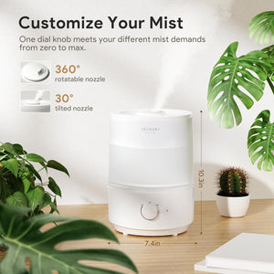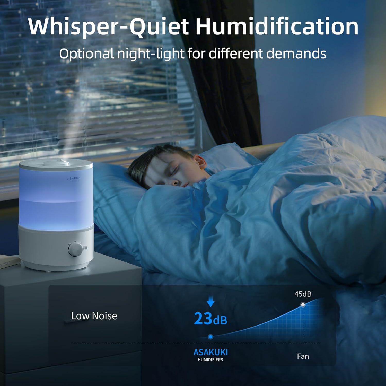 QUIET SLEEP & NIGHT LIGHT: Working sound ≤23dB, this humidifier ensures quiet and complete sleep for the whole family. The mute rotary knob prevents disturbing when adjusting mists. Besides, the low brightness and soft glow from the independently controllable night light, make it an ideal choice for nurseries and children's rooms.