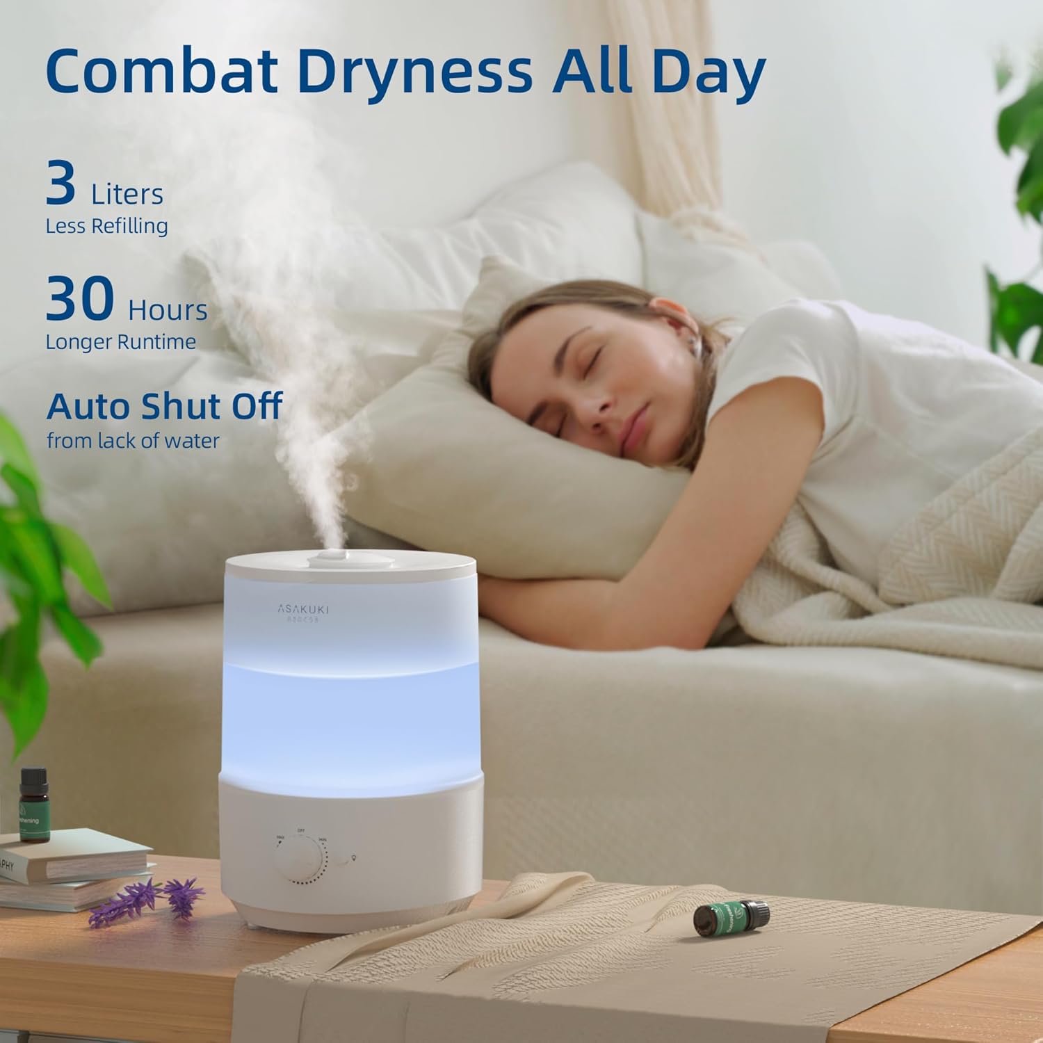 FAST HUMIDIFICATION & ELIMINATE DRYNESS: This 3L humidifier features a 360° rotatable mist outlet & 30°tilted design, which allows you to easily turn mist to your desired direction, to enjoy concentrated misting and fast humidification, to create a healthy life environment. It sprays continuous mist for up to 30 hours at the lowest-mist setting, taking care of your comfortable and peaceful sleep all night.