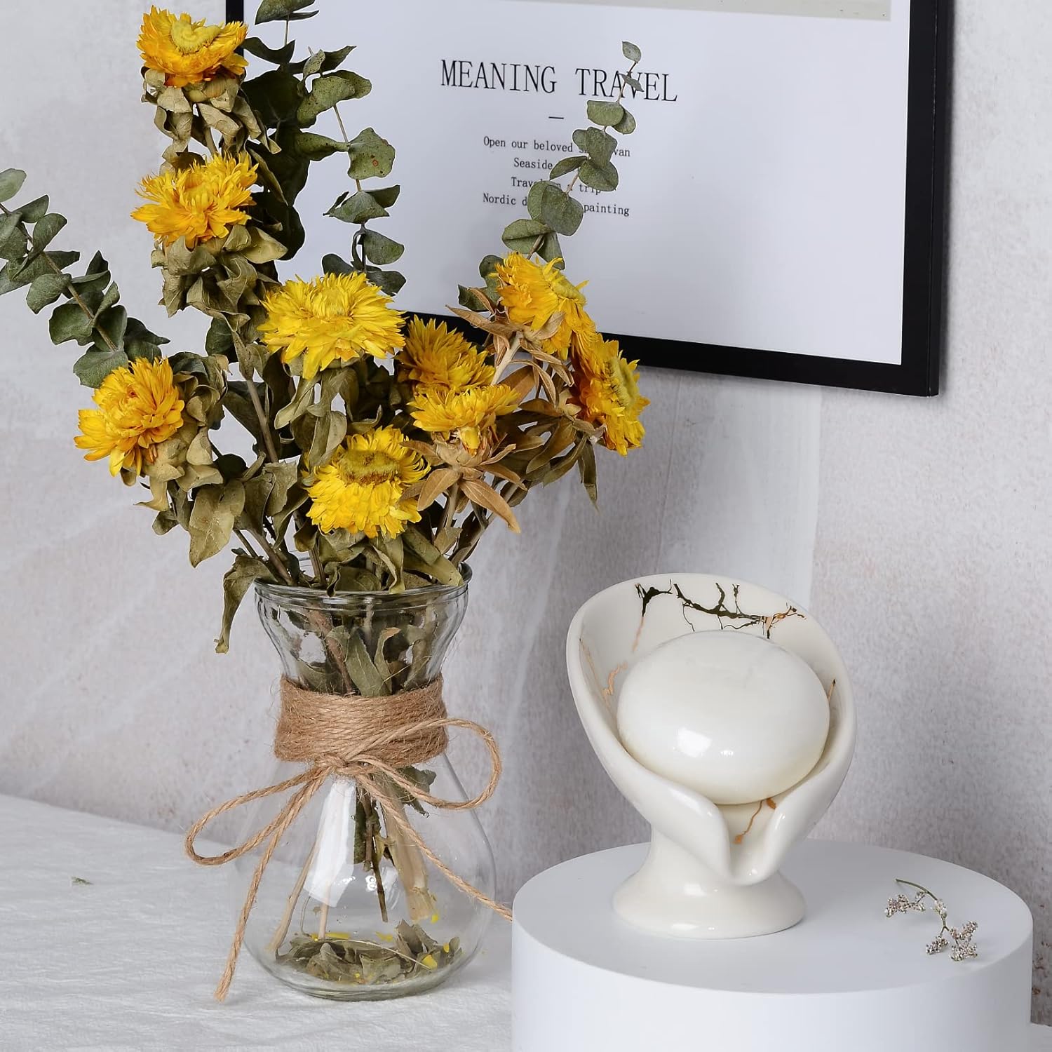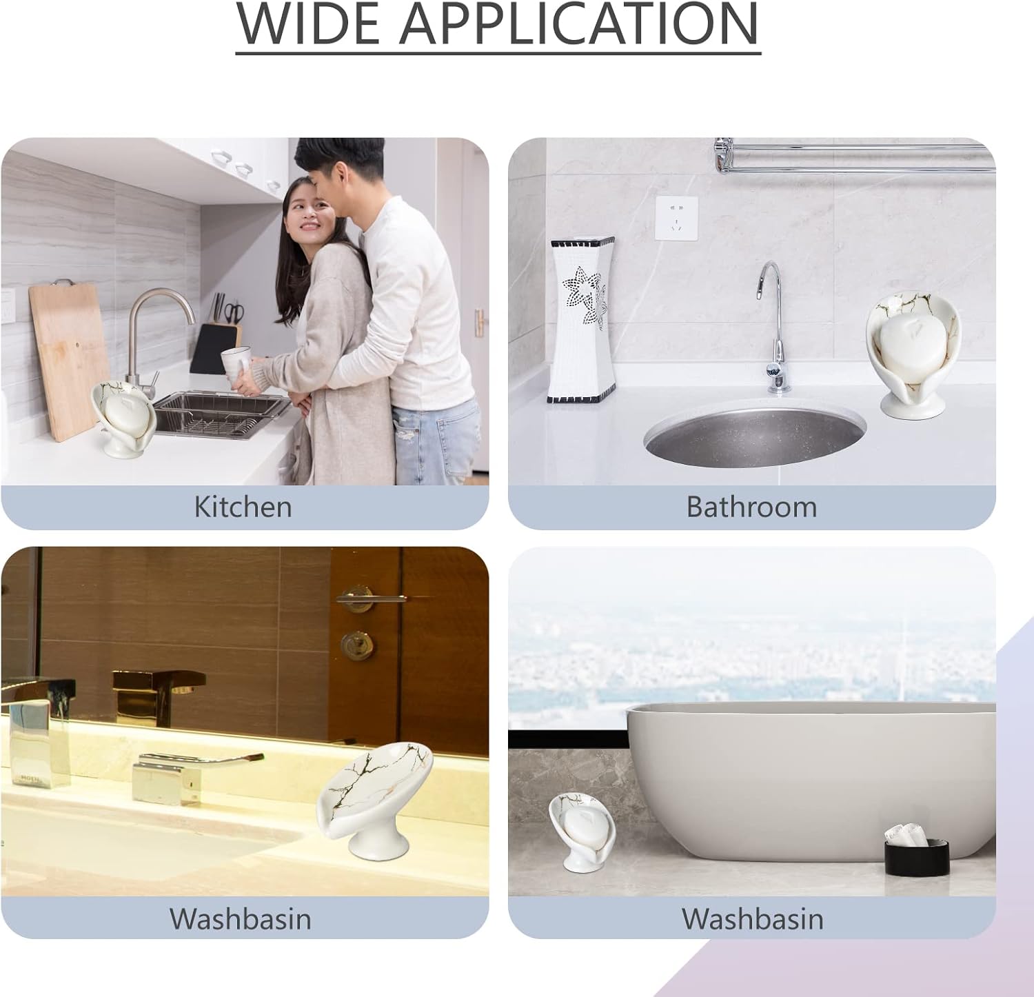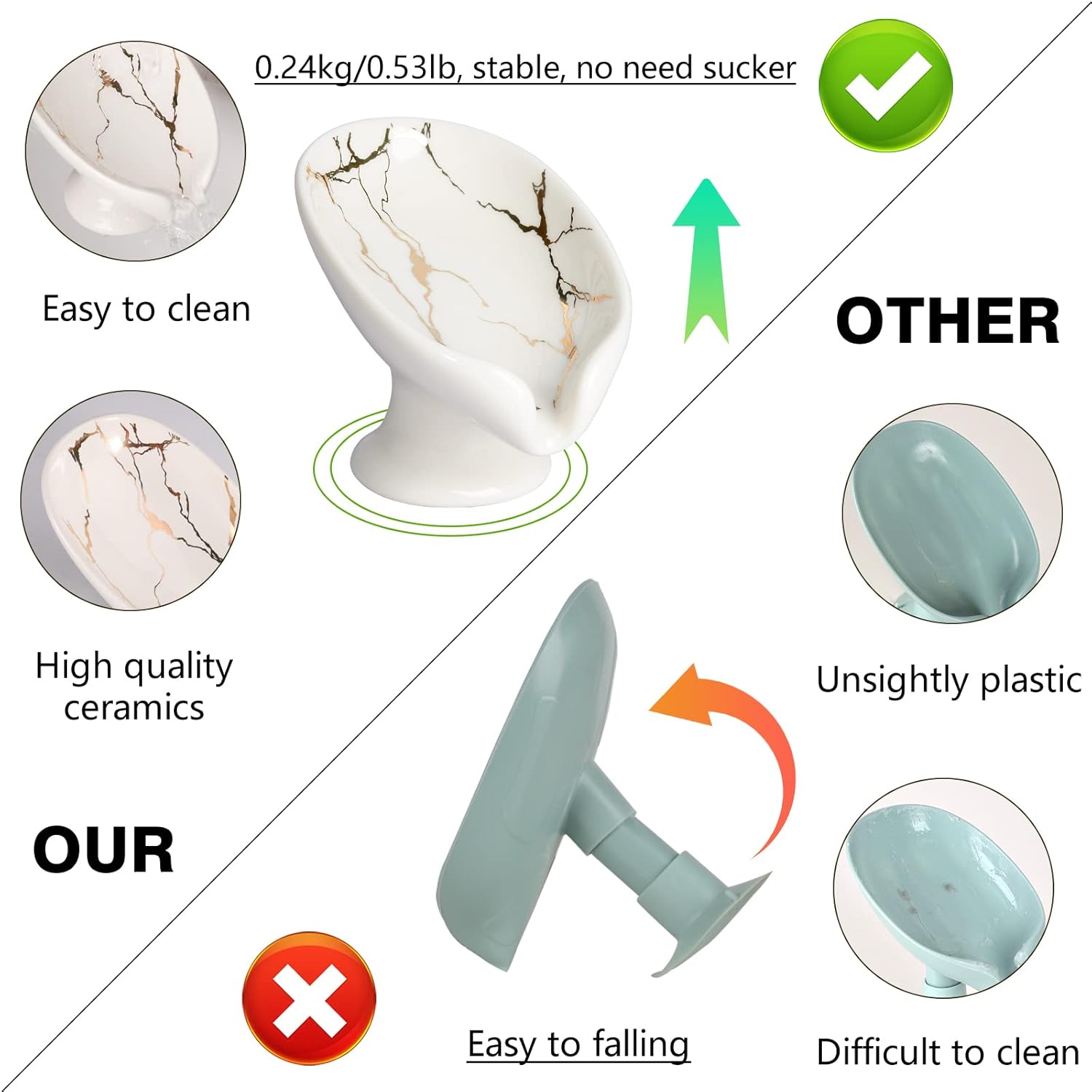 SELF-DRAINING DESIGN: The design of our ceramic soap dish is Inspired by lotus leaves, 45° oblique design, and better drainage performance. Keep your soap dry and reduce waste, no more mushy soap. Note: this soap dish does not have a suction cup.