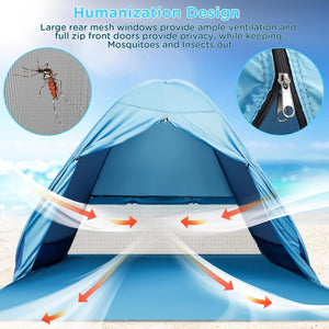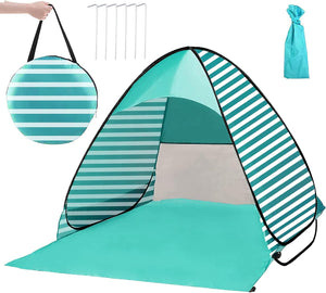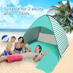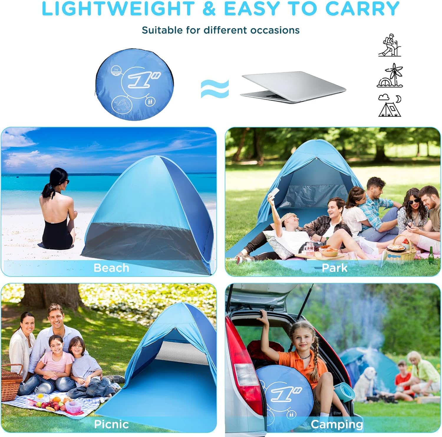【POP UP DESIGN & PORTABLE】The pop-up beach tent can be installed automatically in seconds, no assembly required, and can comfortably fit 2-4 people, 3-4 kids or 1-2 adults . The beach tent is also very easy to fold which folds down to an 45cm diameter travel size, weighs only 1 kg. Comes with a carrying bag, easy to carry and fits easily into the trunk of your car.(When folding, please do not use violence, you can refer to the video)