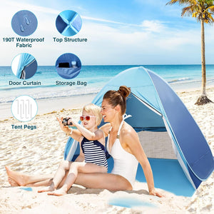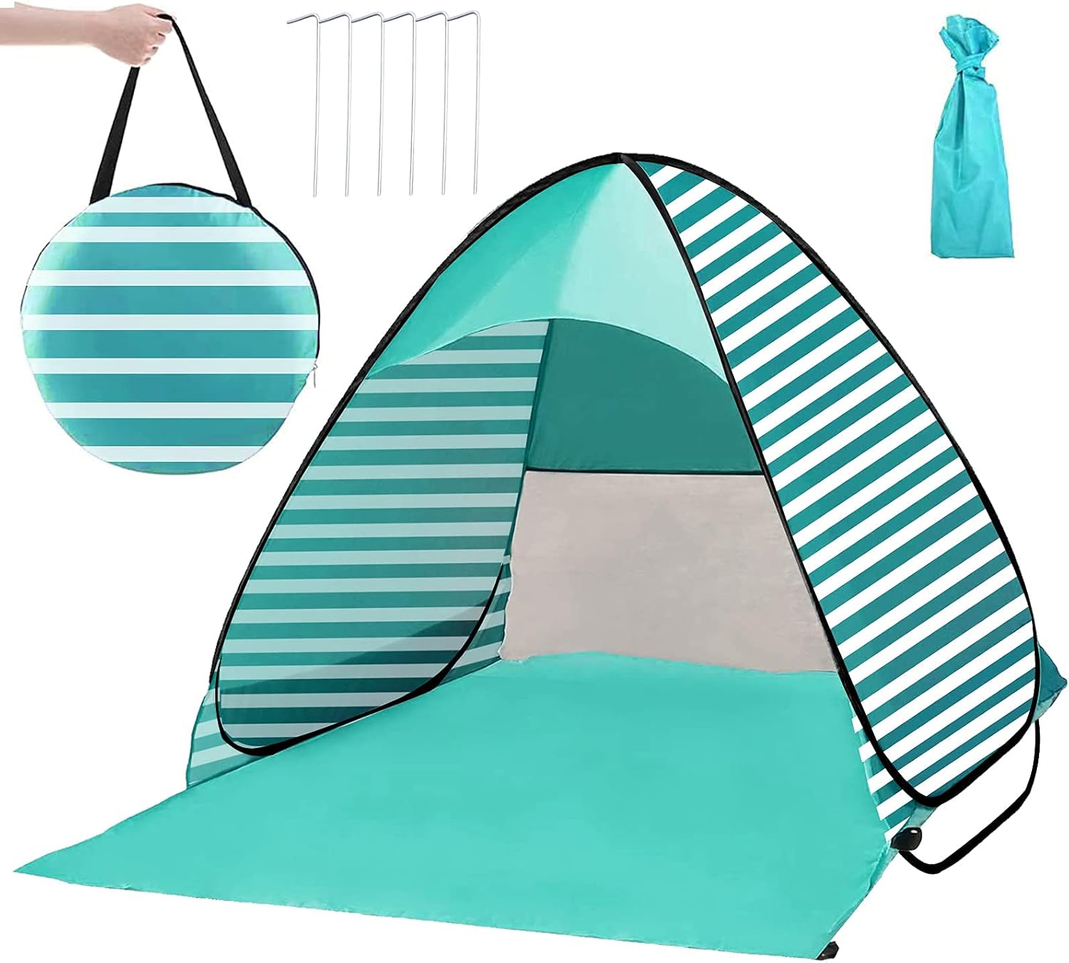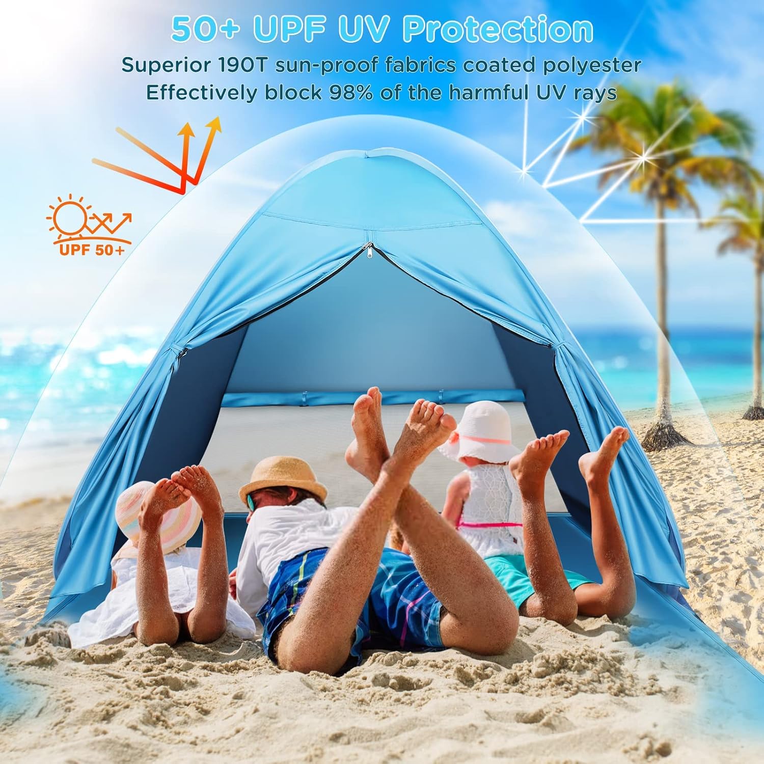 【UPF 50+ UV PROTECTION】The sun shade tent is made of high quality 190T sunscreen waterproof material and full coverage around the lining with special silver-plated fabric can provide excellent UV protection (UPF 50+), blocking up to 98% of harmful UV rays, protecting you and your family all the time. The waterproof fabric design of the portable sun shelters tent will provide you with temporary shelter in light rain, so please avoid using it in heavy rain.