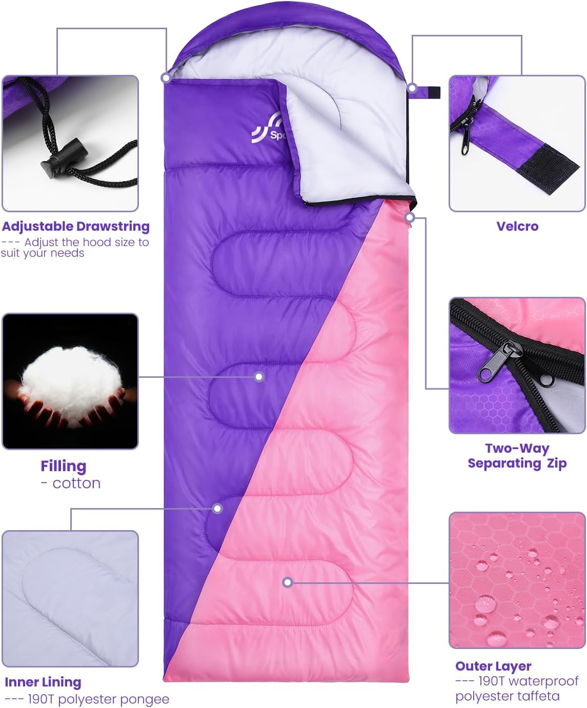 Proper Size: The camping sleeping bag for kids is the ideal sleeping bag for everyone. When unfolded, its dimensions are 87*60 inches which makes it a perfect sleeping pad or quilt alternative. It can cater to people of different heights and sizes.
