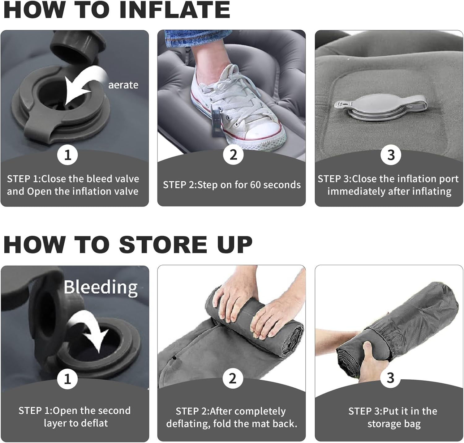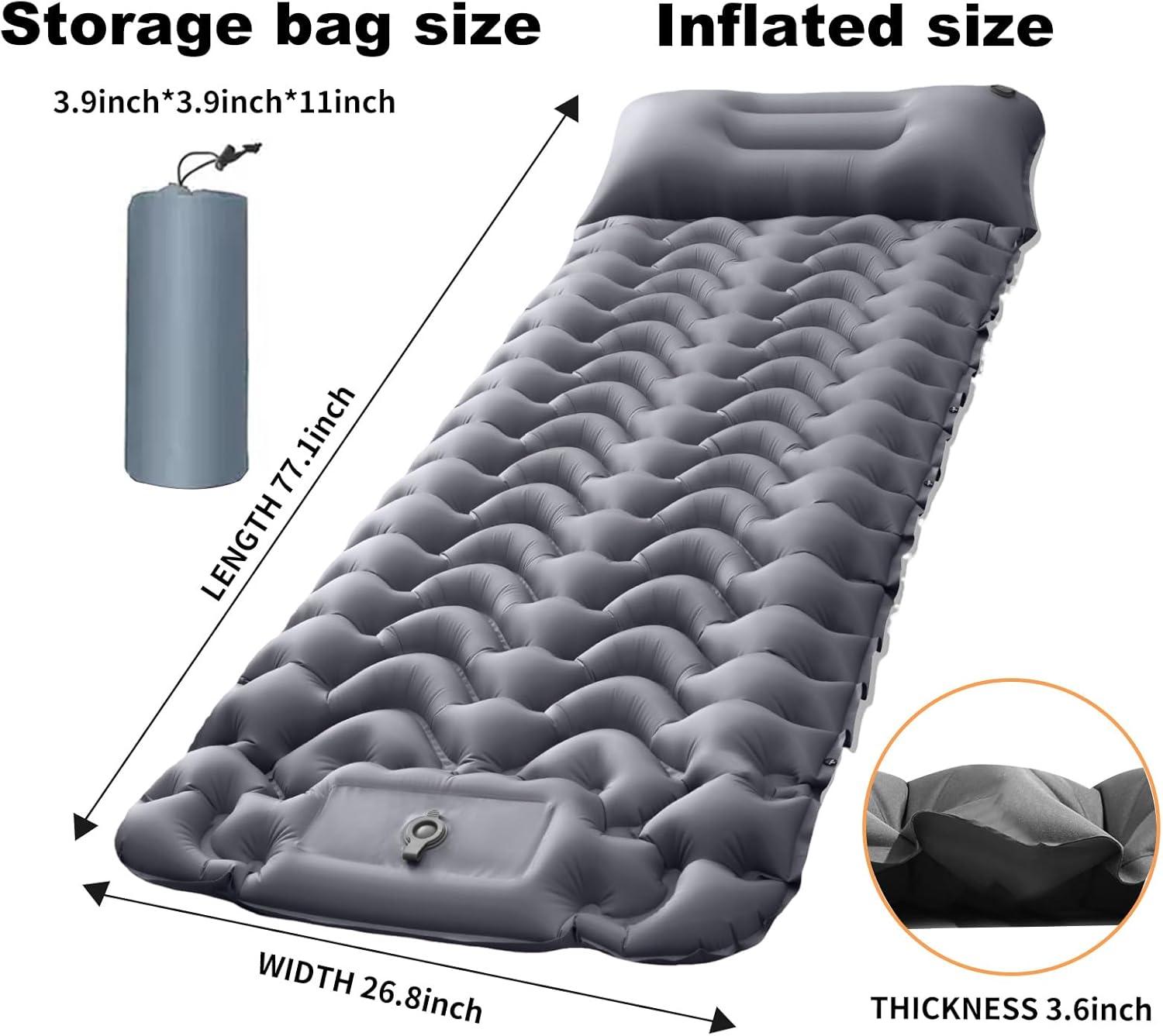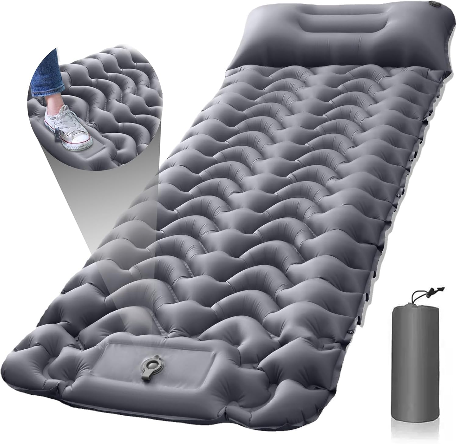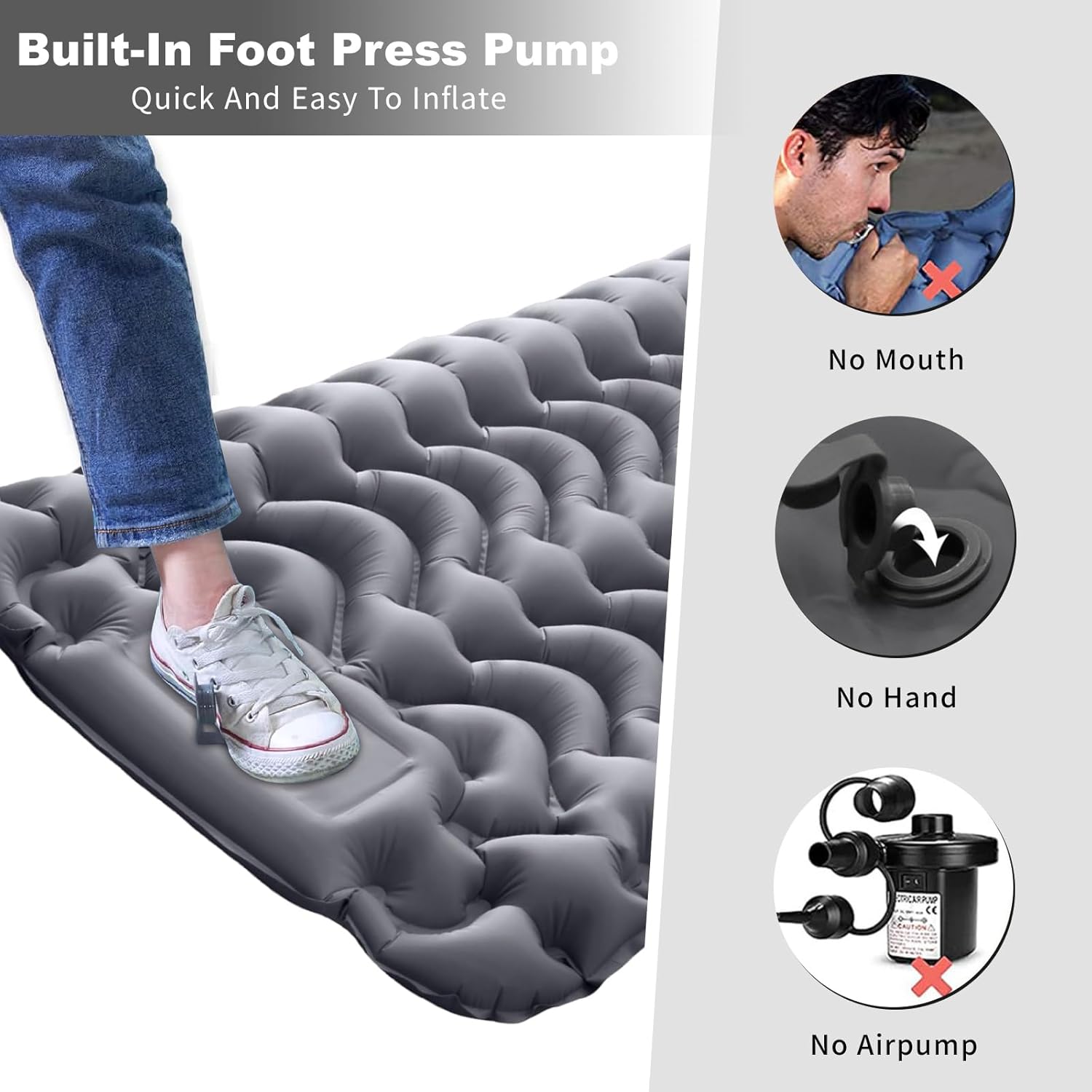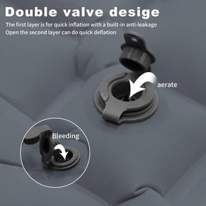 【Inflate by pressing the foot pedal 】This camping mattress pad is inflated by foot pedal, no need to use hands, mouth or pump to inflate. Our sleeping pad for camping is a rebound one-way inflatable structure, foot pedal can complete the inflatable, saving time and effort. Note: The inflation time of this camping sleeping pads on the speed of your foot pressure. Before inflating, please make sure the deflation valve on the back is closed.