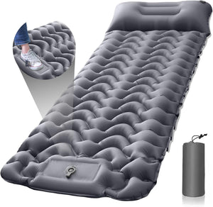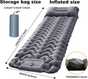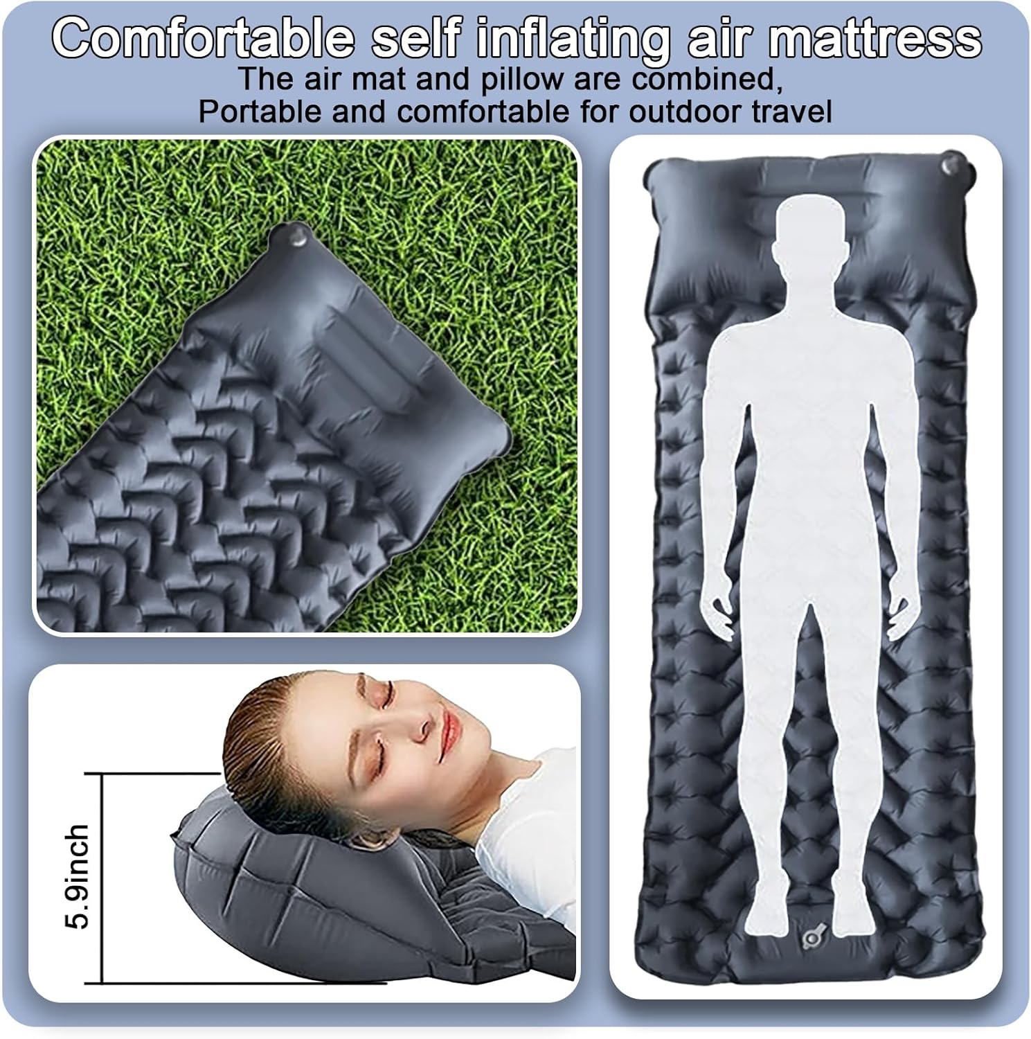 [Durable and waterproof] This inflatable sleeping pad is made of nylon composite TPU, the outer layer of the sleeping mat is covered with the environmentally friendly material TPU, greatly improved abrasion and water resistance, so that the sleeping pad can be used in harsh conditions (rainy days, snowy days, cold winters, hot summers, potholes and uneven ground)