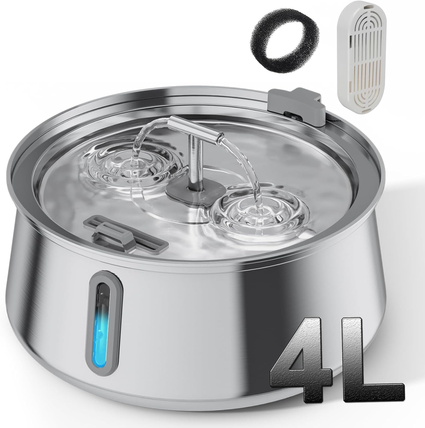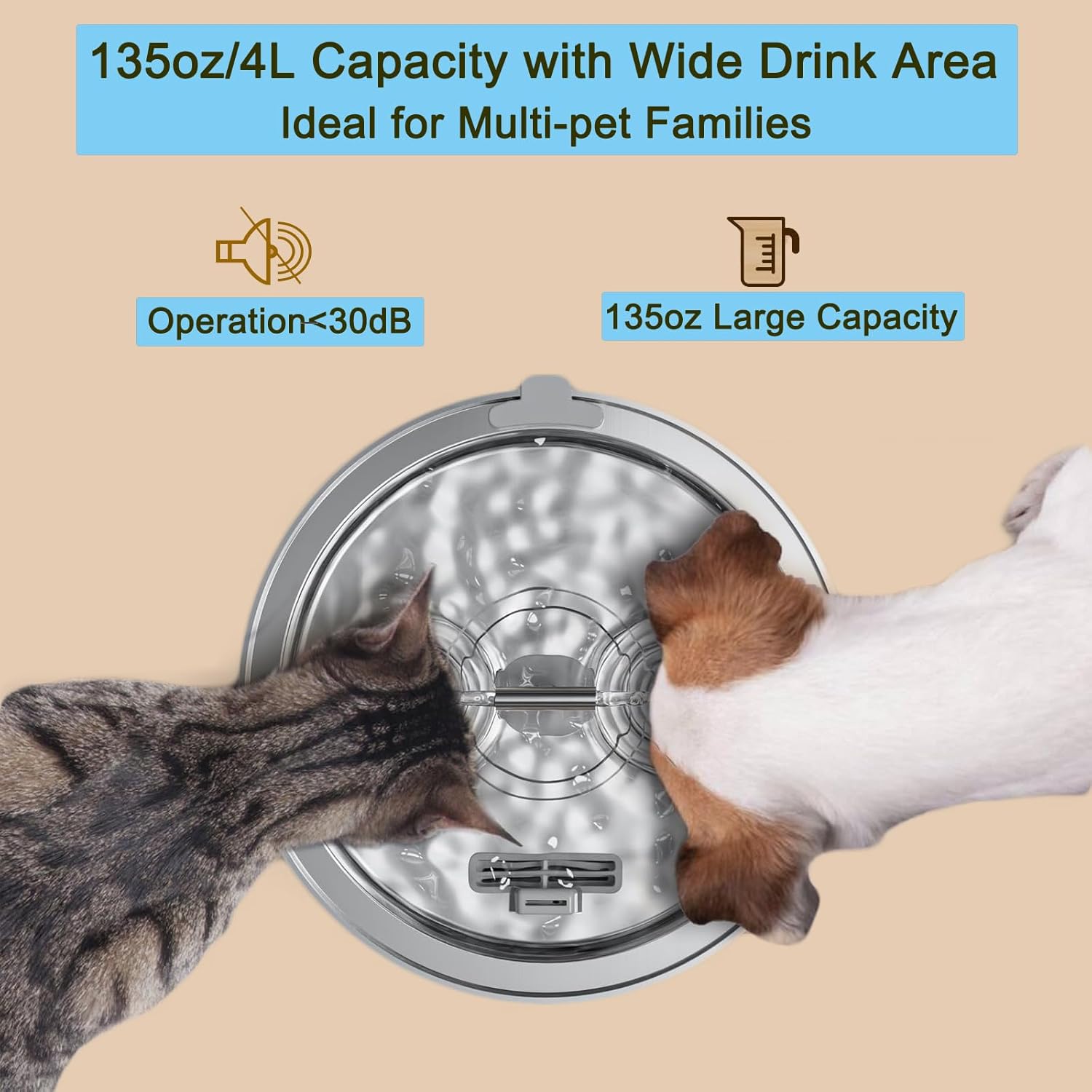đ˝ă Large Capacity & Ultra QuietăThe capacity of pet water fountain is 4L/134 Oz,perfect for multiple pet families.This will allow you to travel with peace of mind.1.5W low-power consumption pump is super silent below 30db while running,allowing you and your pet to enjoy a quiet sleep.