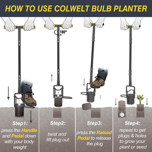 STEP, TWIST, PULL AND READY -- get this gardening bulb transplanter, planting job will be a piece of cake. The long handled bulb planter is easy to install within minutes, and then step, twist, pull and you are ready to plant. Dig 3-1/2” diameter planting holes quickly, one after another, from a comfortable standing position(avoid digging in dry or overly saturated soil).