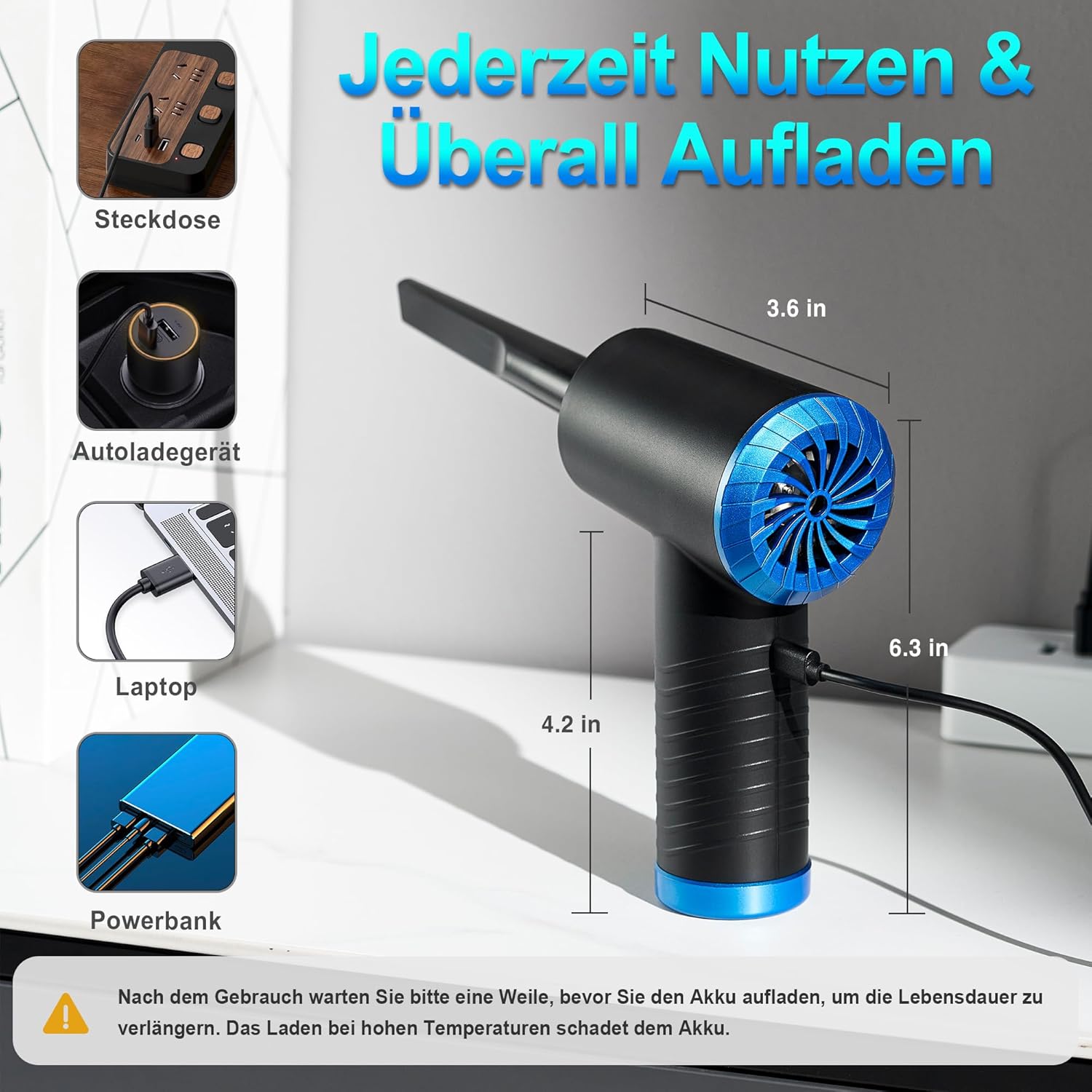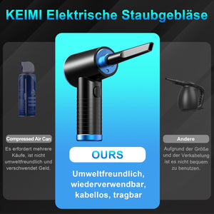 â»ïžăReusable& Energy-SavingăKeimi cordless compressed air cleaner blower is reusable and leaving no trace of harmful chemicals, liquids or freezing agents during the cleaning process, which can perfectly replace the canned compressed air.