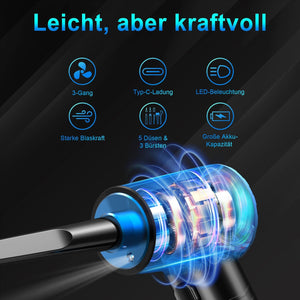 đ§čăMultiple UseăComes with 5 sets of nozzles ans 3 brushes, you can change the nozzle according to your cleaning needs. Press the power putton to use, the led light help you to clean in the dark place easily. Suitable for dust removal of keyboards, air conditioners, computer cases, cars, lily windows, etc. Besides, this compressed air duster can effortlessly inflate your pool toys, air mattresses, and more.