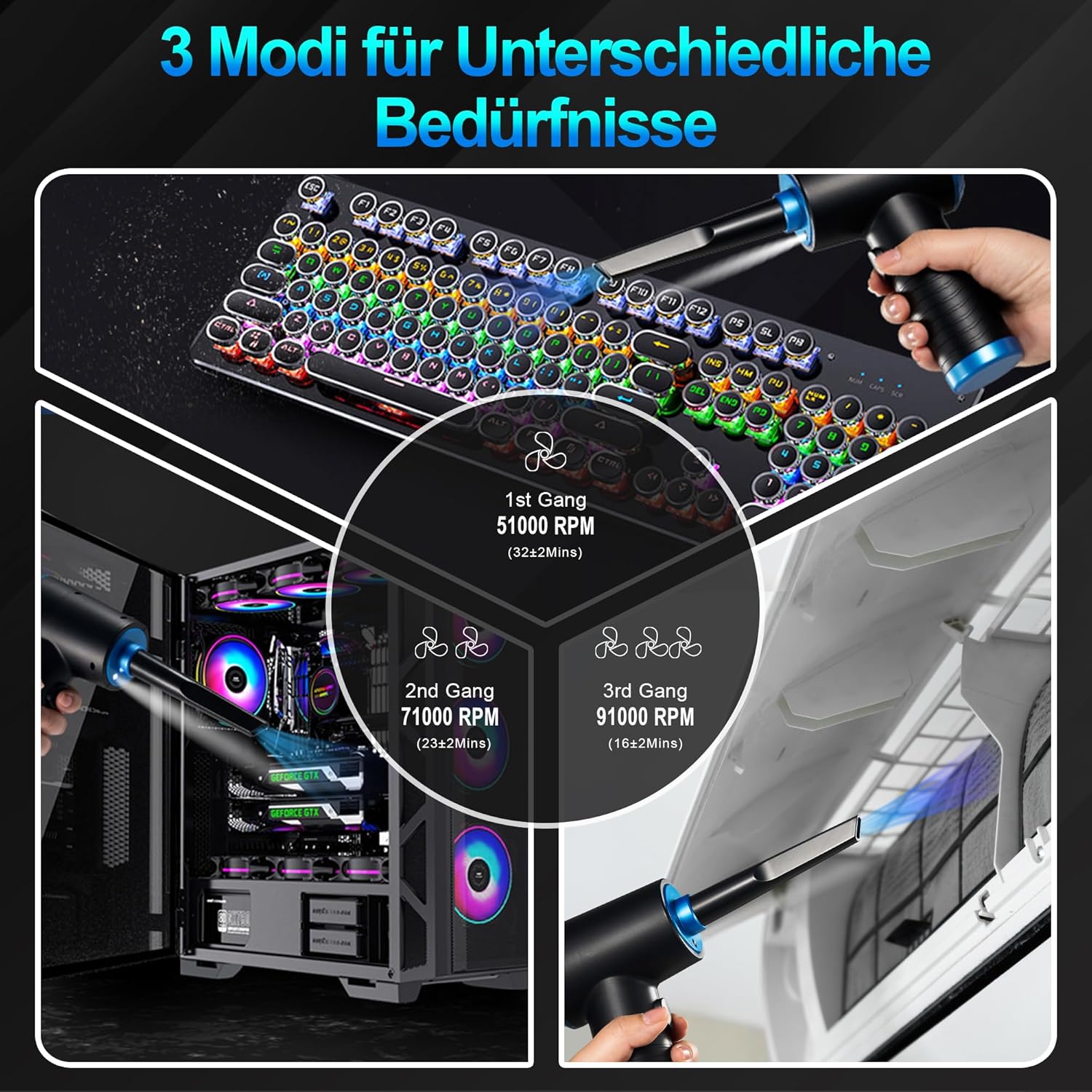 đȘăPowerful Compressed Air DusterăThe Compressed Air Duster features high speed, strong airflow and low power consumption which speed up to 91000RPM. Keimi compressed air duster has 3 speed settings(51000RPM, 71000RPM and 91000 RPM) to choose, blow away debris and dust from any electronic equipment.