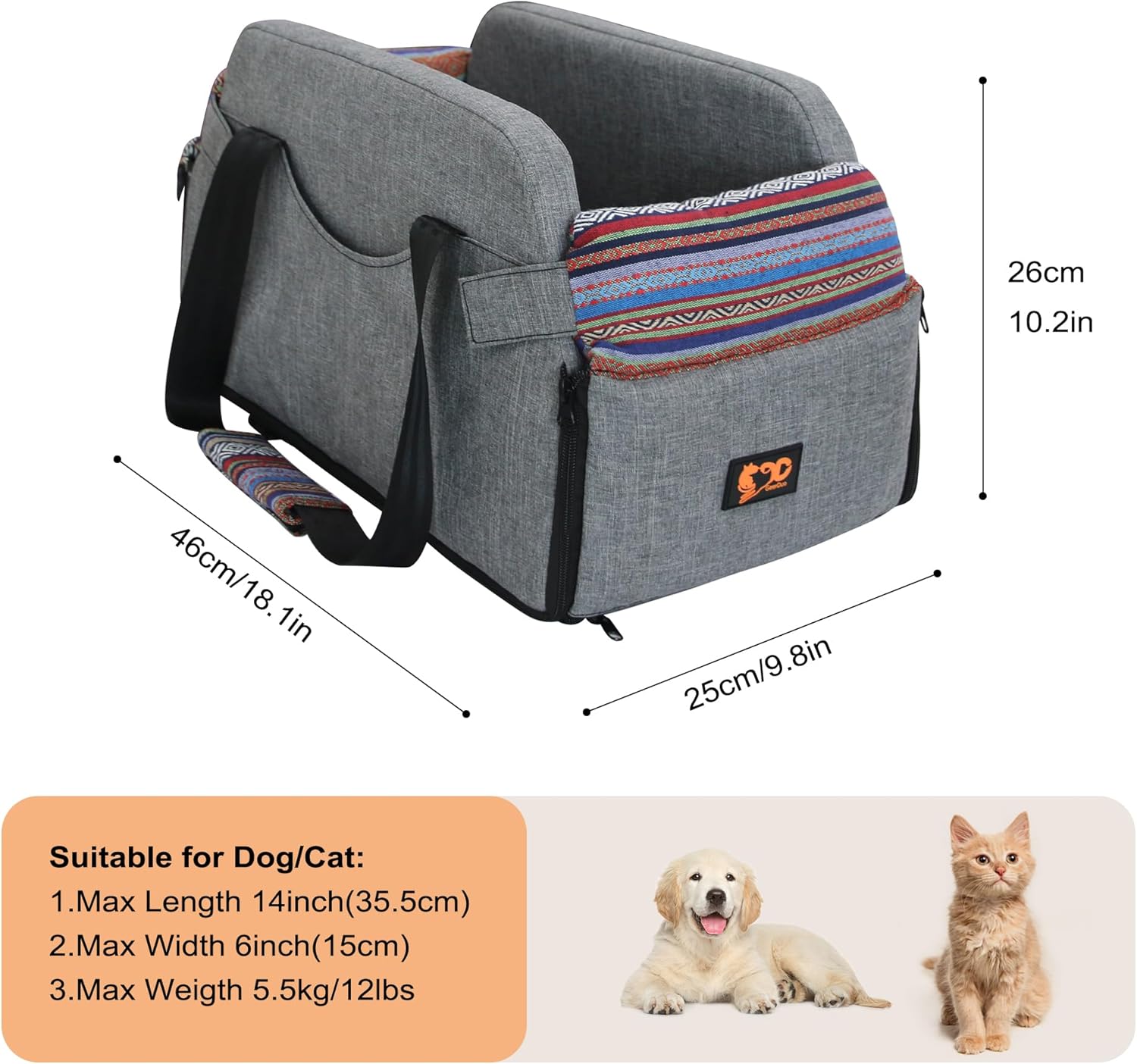 SUITABLE FOR SMALL DOGS: Product dimensions (L*W*H ): 18in (45cm) * 10.43in (26.5cm) * 10in (26cm). The car seat supports the pet less than 16lbs which is recommended for small dog or cat