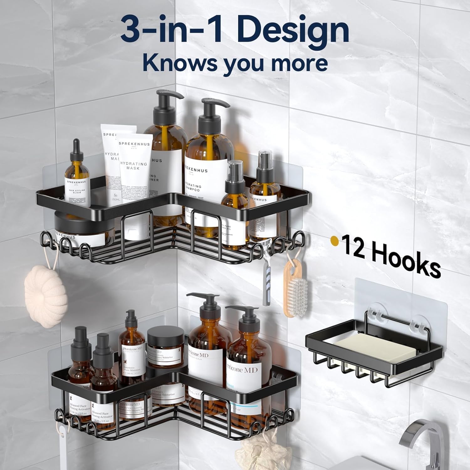 Humanized 12 Hooks and Soap Holder: 12 hooks of the adhesive shower caddy and separated soap holder design solved storage problems. Leaving more space for bath sponges, razors, bath brushes, and other washing accessories on this corner shower caddy