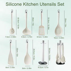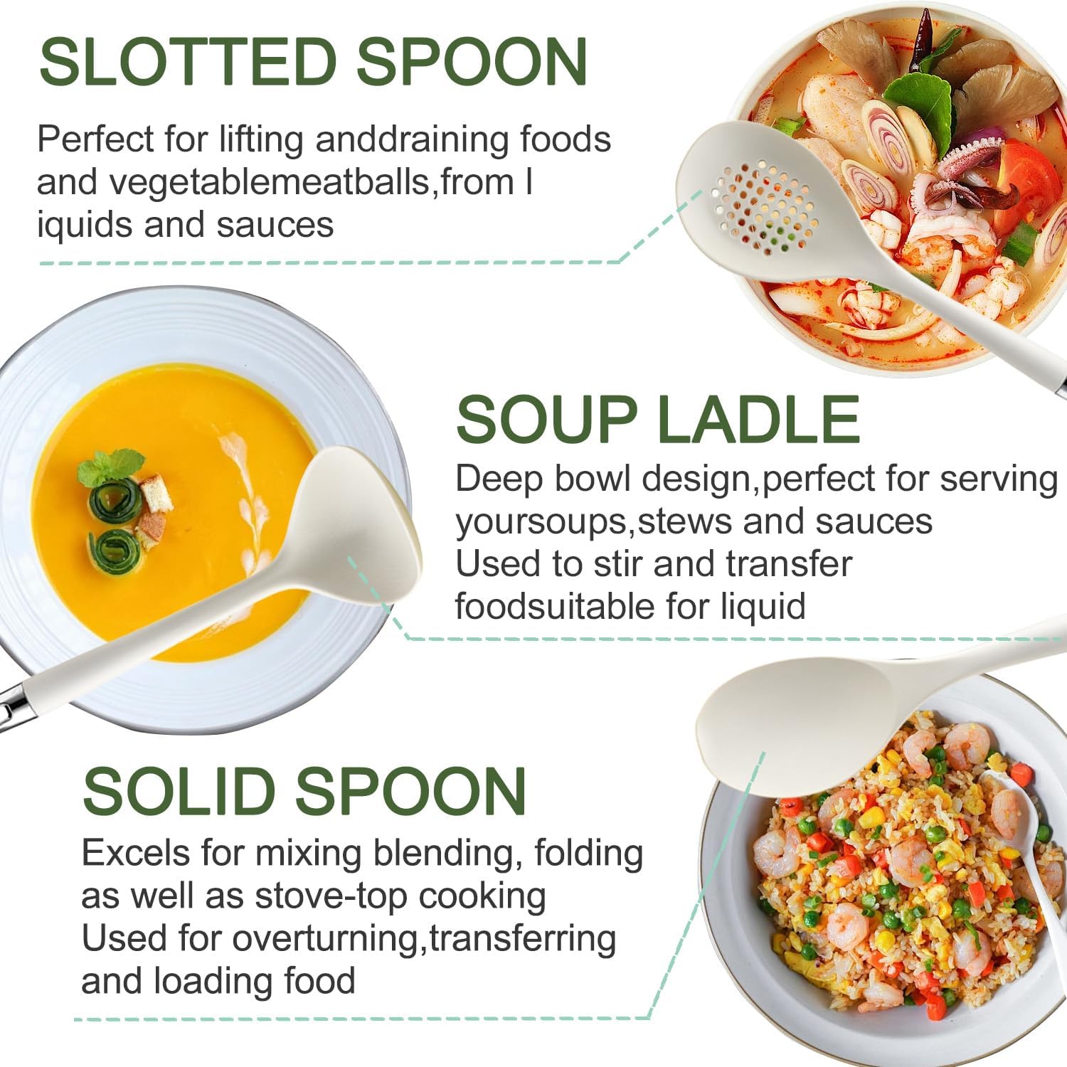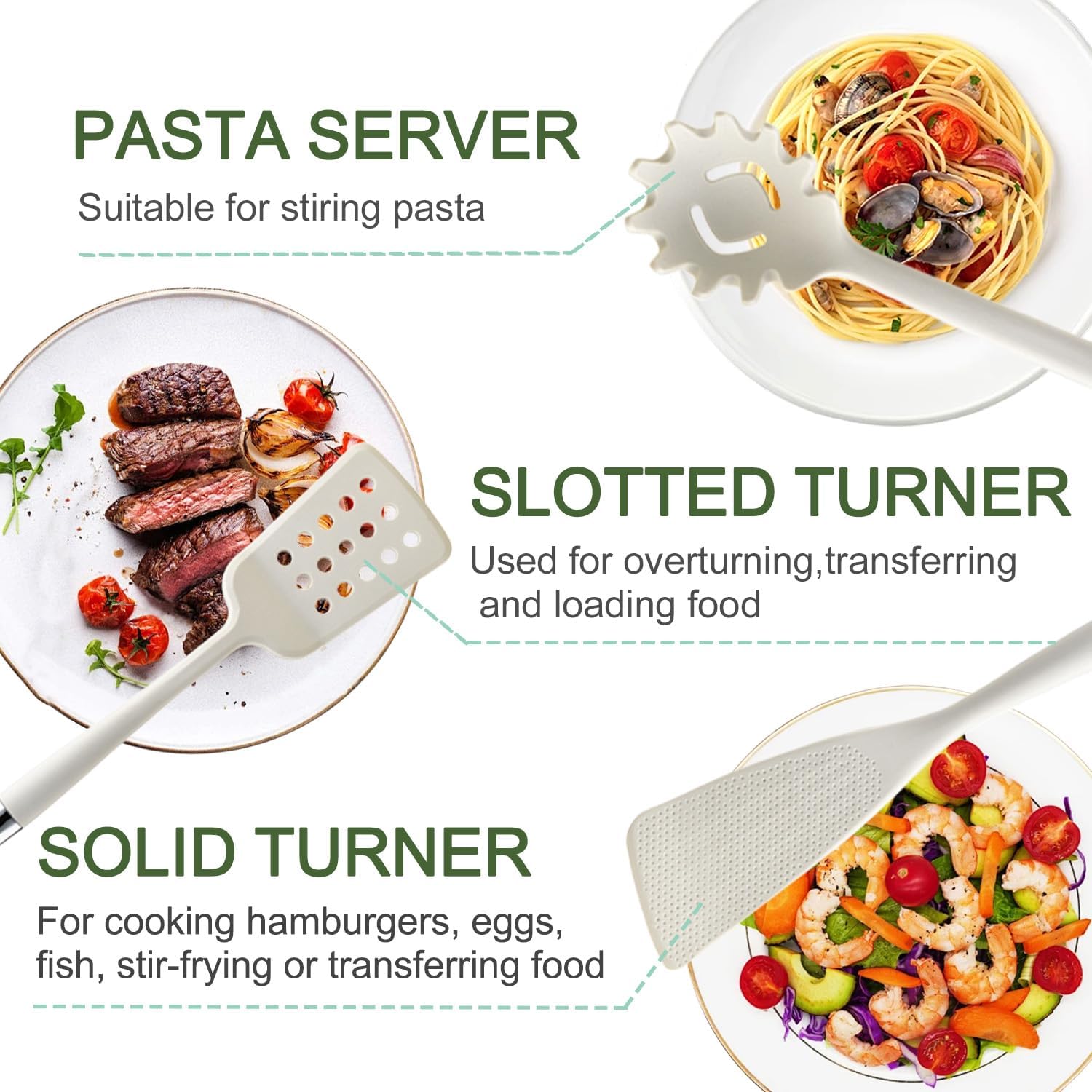 Heat-Resilient, Non-Melting Silicone Handles: Crafted to withstand temperatures soaring up to 446°F, our silicone cooking utensils guarantee zero melting or smoke emission, even during intense frying sessions. The ergonomically designed silicone handles effectively block heat transfer, safeguarding your hands and ensuring a hassle-free cooking journey. Perfect for any new abode, this essential set adds a touch of elegance to your kitchenware.
