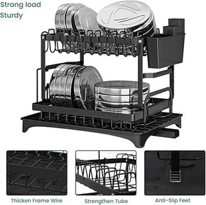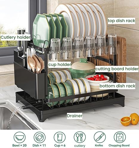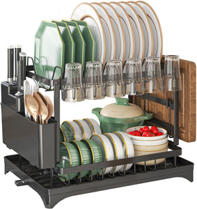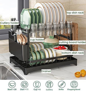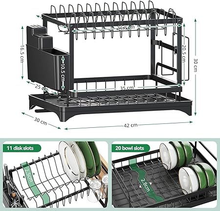 【LARGE CAPACITY】- 2 Tier dish drying racks provides large space to drying washed plates, bowls, glasses and other kitchenware, keep your kitchen counter tidy, dry and organized. Ideal for a family of 4-5 or kitchens with limited space. Rack size: 42(L)*30(W)*30(H) cm