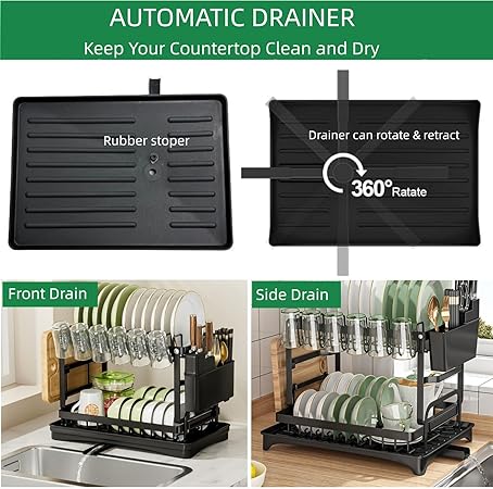 【AUTOMATIC DRAINBOARD】- Dishes drying rack features an automatic drainage system. The removable drip tray catches excess water to flow quickly to the swivel spout, which is 360° rotating and retractable for directing water over the sink, and you can adjust spout depending on the position of your sink
