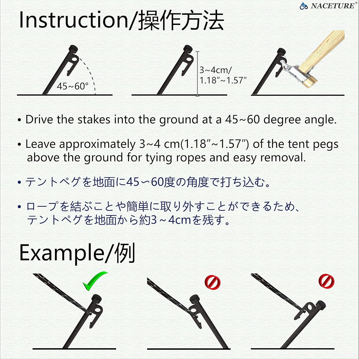 👌Thickened Reinforced Nail Head Design – Thicker and more durable than standard canopy stakes heavy duty our metal tent stakes head thick design is 6mm instead of 2mm to provide longer-lasting resilient when driving them into hard ground or packed sand.