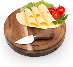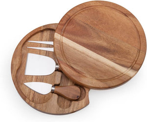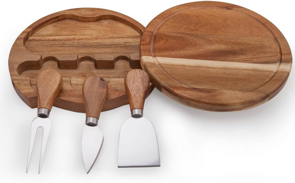 Suitable for cutting and serving cheese and foods. Set includes an acacia wood cutting board with acacia wood handle cheese fork, cheese spatula and cheese knife.