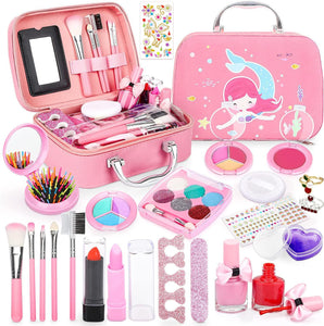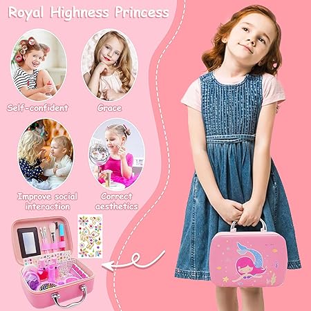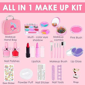 SUPPER RICH GIRLS MAKE UP KIT FOR KIDS INCLUDES 23 PCS: Folding Comb x 1, Rings x 2, Gem stickers x 1, Nail Sticker x 1, Nail Polishes x 2, Makeup Brushes x 5, Glitter Lip Gloss x 1, Lipstick x 2, Eyeshadow x 3, Blush Palette x 1, Powder Puff x 1, Toe Separator x 1, Nail File x 1, Cute Mermaid Cosmetic Case x 1. Kids makeup kit for girl is specially designed for kids and little girls, which is safe and easy to clean up.