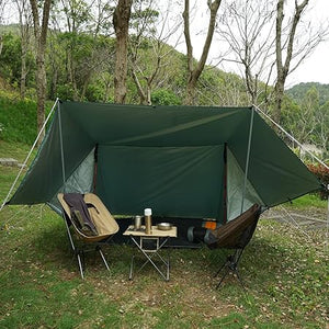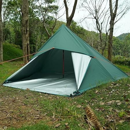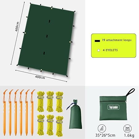 Spacious Shelter: The rain fly is 4X4m Tarp with 19 loops, so the shadow area is 9 square meters. It is big enough for 4-6 people.