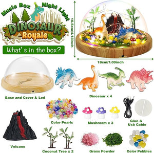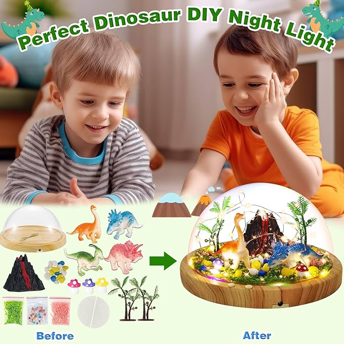 【Set Includes】Arts and crafts night light include 1 Dinosaur, 1 Volcano, 2 Coconut Tree, 3 Mushroom, 1 Wood Base with Led Music String Light and Cover, 1 USB Cable, 2 Nano Adhesive and User Manual, 1 Bag Color Pearls, 1 Bag White Pebbles, 2 Grass Powder. Create to belong to your own night light. Handmade lights that are creative and handmade are fun crafts that are enjoyed by all ages.