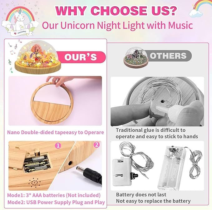【Extensive DIY Craft Kit】The unicorn music night light is made of high-quality ABS material and is durable. The lampshade has transparent snaps that won't break. The Unicorn lighting is handmade and has two power supply modes: 3 AAA batteries (not included) or USB power. It is convenient and easy to use, and is suitable for decorating children's bedrooms.