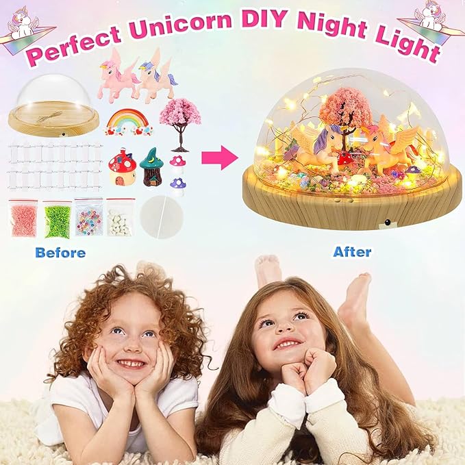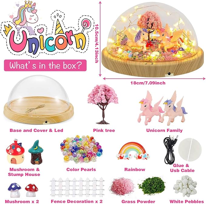 【Set Includes】Arts and crafts night light include 2 x Unicorn Family & 2 x Mushroom, 1 x Wood Base with Led Music String Light and Cover, 1 x USB Cable and 2 x Nano Adhesive and User Manual, 1 x Mushroom & 1 x Stump House, 1 x Bag Color Pearls, 1 Set Pence Decoration, 1 x Bag White Pebbles, 1 x Pink Tree & 2 x Grass Powder, 1 x Rainbow. create to belong to your own night light. Handmade lights that are creative and handmade are fun crafts that are enjoyed by all ages.