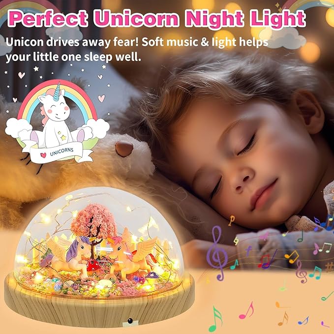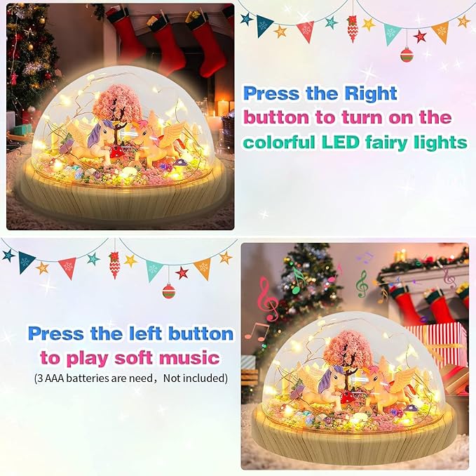 【Easy to Operate】To create a music night light decor, simply press the right button and turn on the colorful LED fairy lights. Press the left button to play more than 10 pieces of music in a loop. The operation steps are simple, easy to assemble, and no experience is required. Operation steps: First need to stick the film, paste the small accessories, wind the filament, and close the lid, you can enjoy the beautiful scenery brought by Unicorn toys, the fairy-tale lighting creates a warm atmosphere.