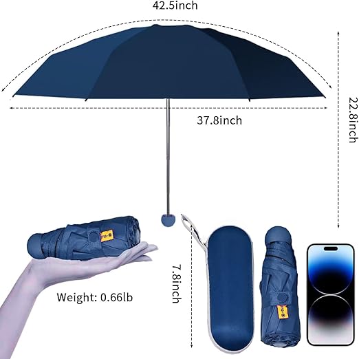 • 【ULTRA LIGHTWEIGHT & COMPACT】: This compact umbrella is only 10 oz weight, 7.5-inch length yet opens to form a large 38"(not 34") canopy, fitting perfectly in your makeup bag, pockets, briefcase, suitcase or backpack.