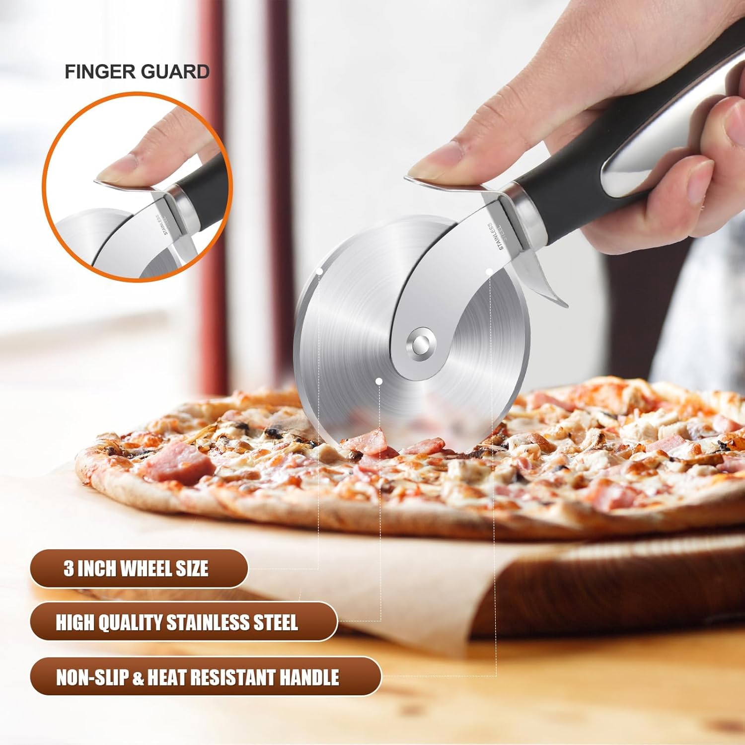 🍪HIGH-QUALITY AND ERGONOMIC DESIGN: This pizza slicer is made of premium, rust-resistant stainless steel, making it durable and long-lasting. It is also designed with a built-in protective guard to place the finger when slicing a pizza; the non-slip, curved handle provides comfortable use.