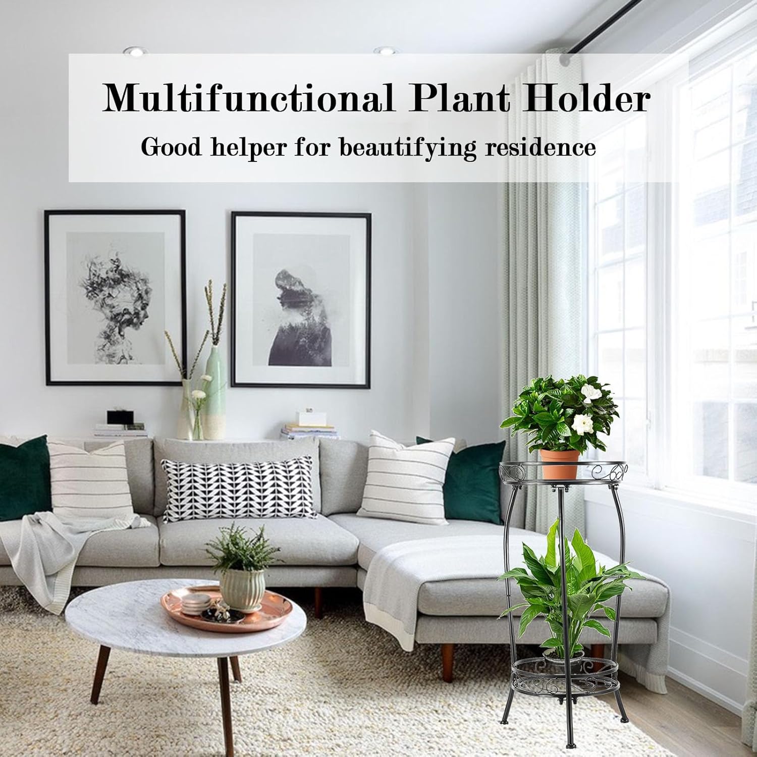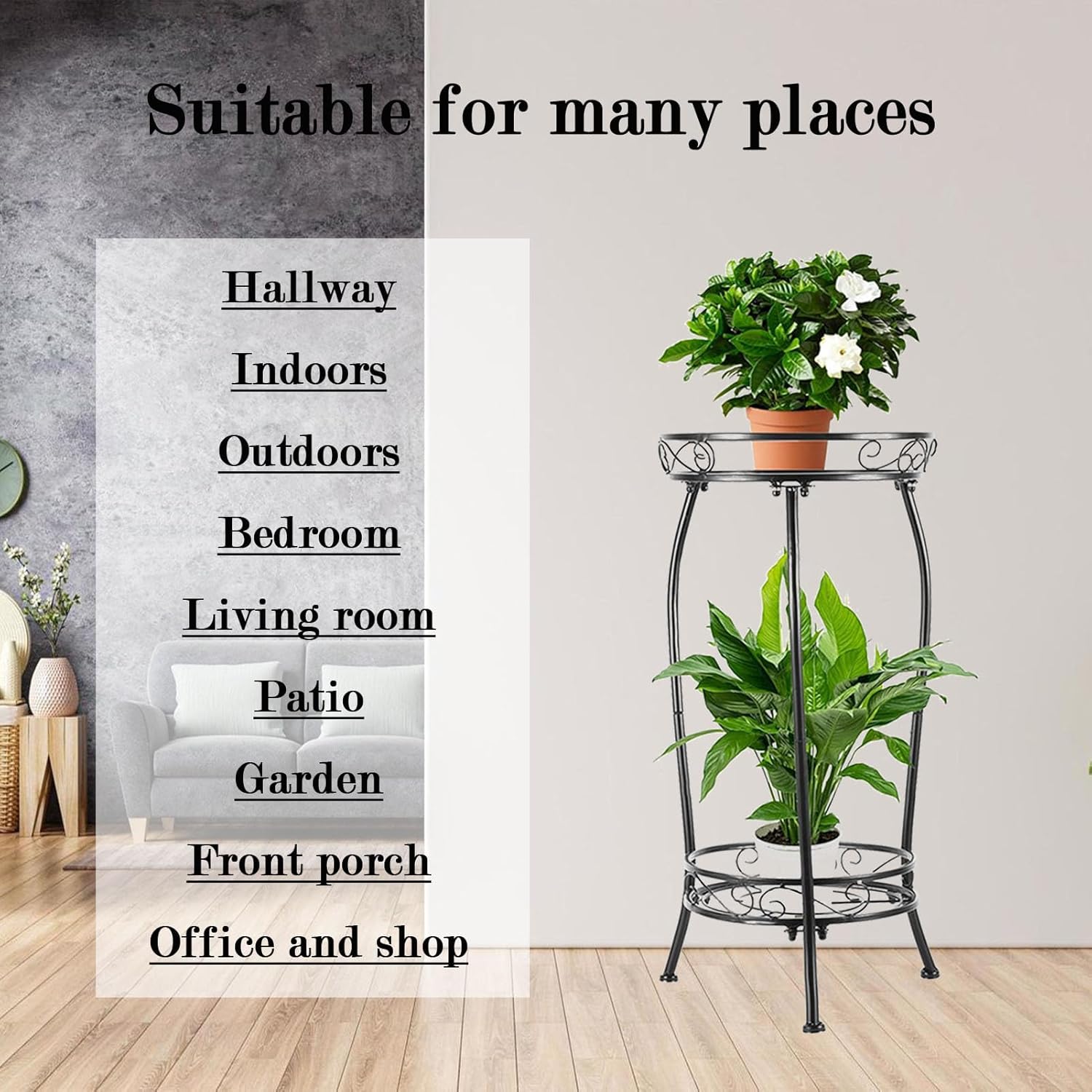 【Corner Plant Stand】This 2-tier plant shelves has a sturdy design and can display plants weighing up to 100 lbs. The sturdy steel construction is treated with a weather-resistant coating for added durability, and can be used indoors or outdoors in corners, entrances, gardens, offices, or bathrooms, and is sure to create an attractive potted flower or plant display.