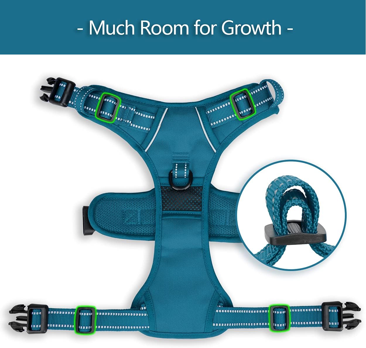 EASY ON & OFF: This dog harness equipped with 3 quick release snap buckles at neck and chest, making it much easier to put on and remove. You don’t have to fight to get it over dog’s head. The locking mechanism makes it pretty secure, so no worry about accidental release.