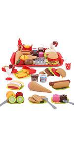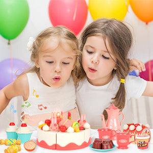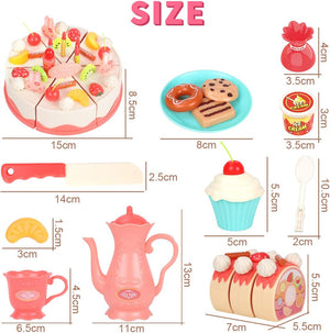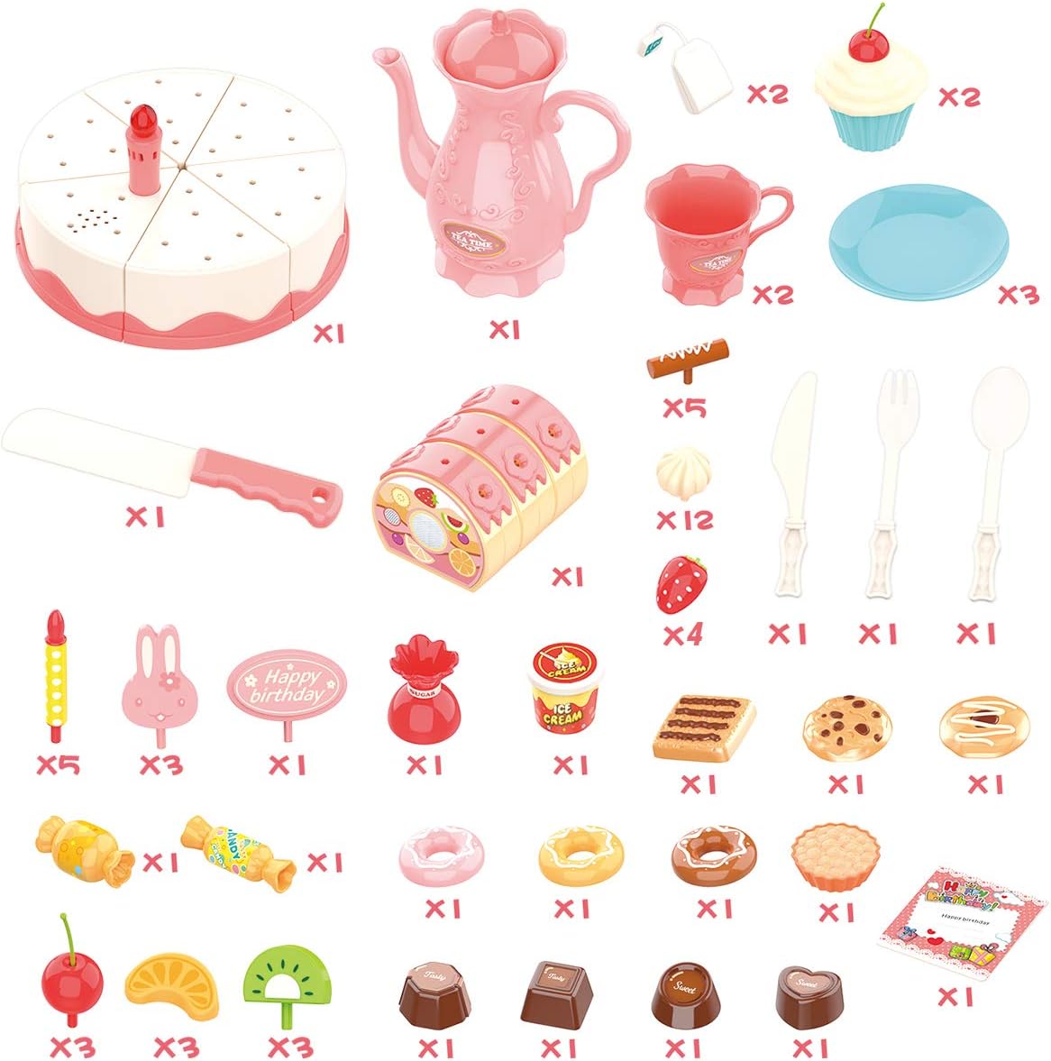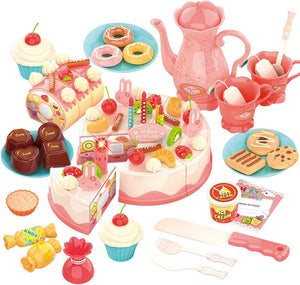 [Rich Food Playset]Including birthday cakes, kettles, cups, tea bags, cake cups, roll cakes, plates, knives, forks, spoons, candles, candy, ice cream, cookies, chocolate and some cake decorations,total 82PCS. Many food toys for children's role-playing will bring endless joy to boys and girls.