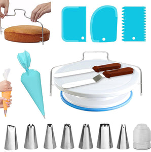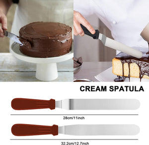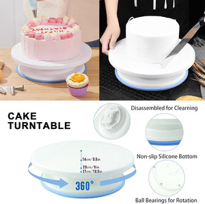 - Cake Decorating Set: This product includes 11-inch decorating cake turntable, 7 frosting tips, 11-inch straight and angled frosting spatula, cake leveler and slicer, 20 disposable bags, 3 cake spatulas, frosting smoothing set