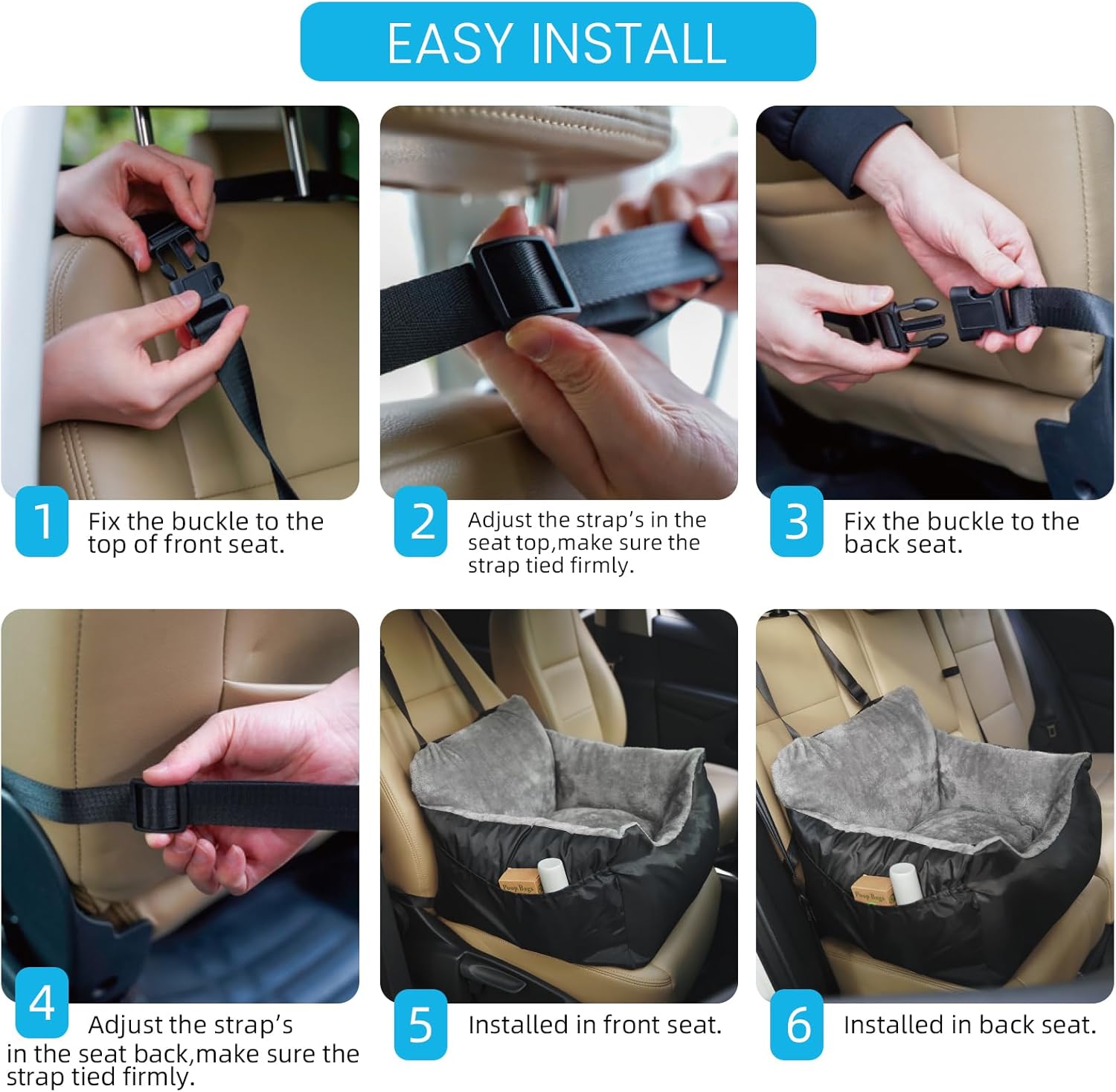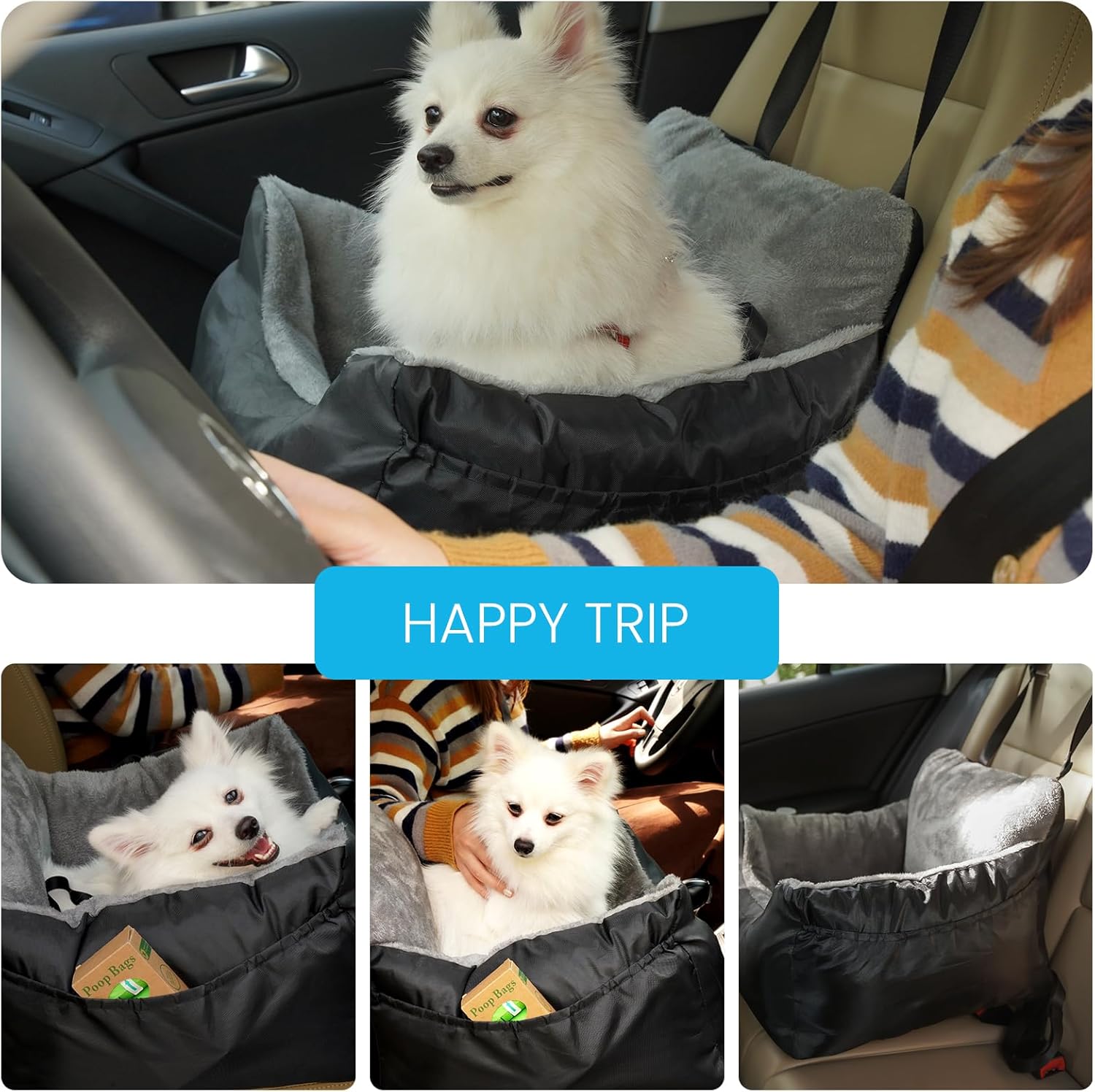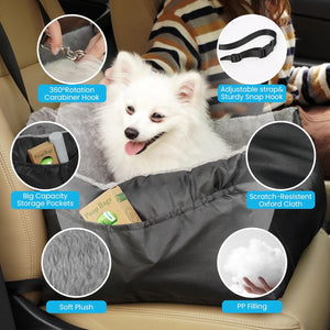 Safe and Distraction-Free Trip - Our dog car seat is designed with an adjustable buckle strap and a sturdy snap hook to keep your puppy in place and prevent them from jumping out. The bolsters of the car dog bed are filled with fluffy PP cotton, providing excellent support for your pet's body during your road trip, protecting them from hurting by sudden stop or road bumps. With our dog booster seat, you can focus on driving and enjoy a fantastic trip with your lovely little furry friend.