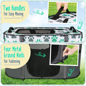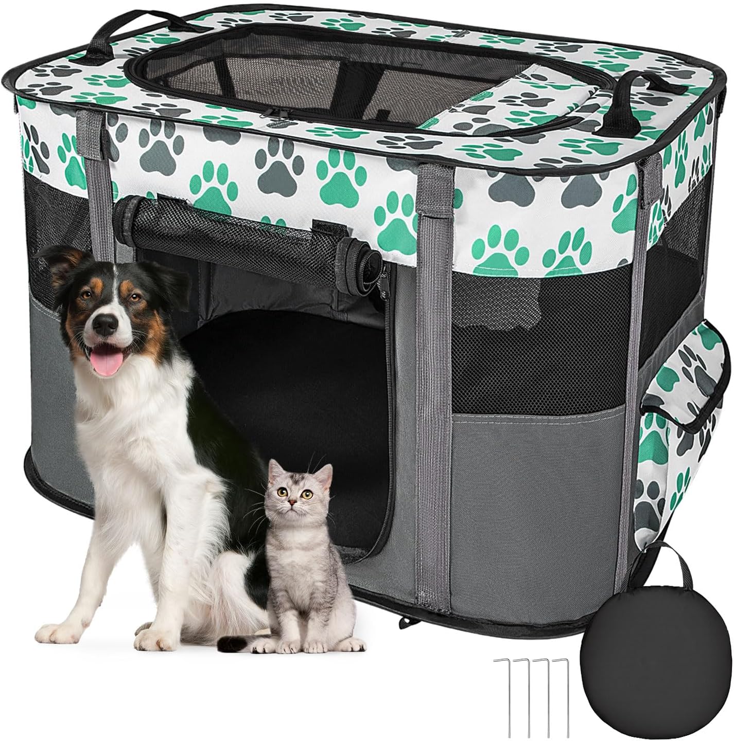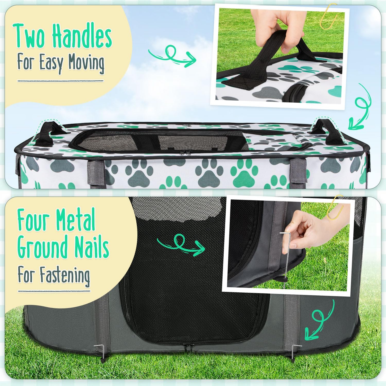 Suitable for Indoor and Outdoor Use --- The puppy playpen serves as a comfortable indoor resting place for postpartum cats or as a secure shelter for small animals. It features two top handles for easy transport and placement anywhere. The bottom is crafted from water-resistant polyester taffeta fabric, effectively preventing urine from seeping through when used indoors. Outdoors, the cat fence comes with four ground stakes for added stability.