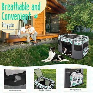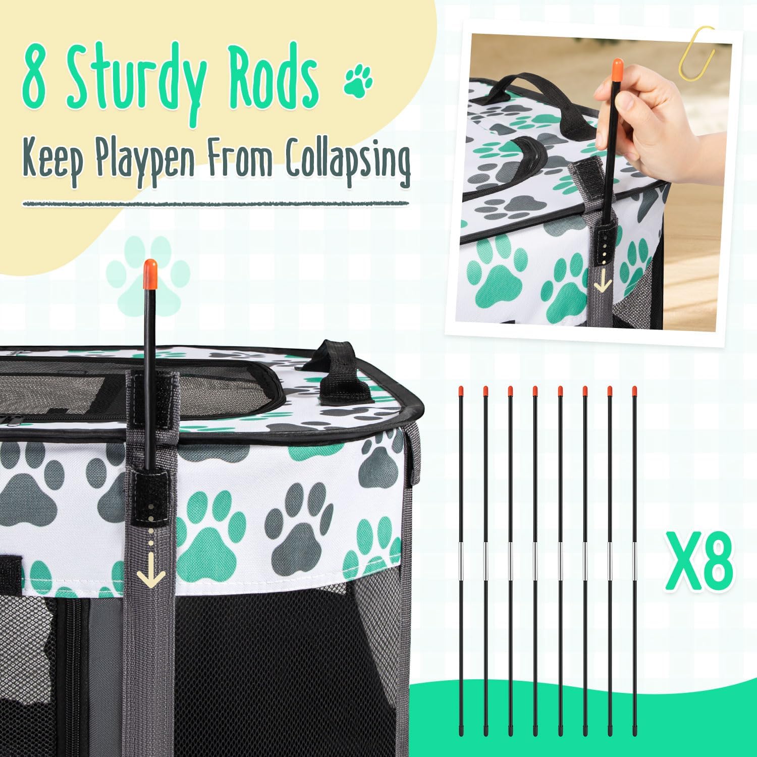 Sturdy and Durable --- Constructed from durable 600D Oxford cloth material, the animal playpen withstands any attempts by small animals to tear it apart. Eight metal support rods easily fit into corresponding slots, providing support and preventing it from collapsing. Equipped with a front door and a top zipper, the cat kennel offers convenient entry and exit for your pets, as well as easy access to food and water.