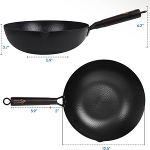 HANDLES HIGH HEAT AND SCRATCHES - Carbon steel wok has no tefflon coating and can sustain super high temperature without damage. You can use metal utensil and no need to worry about scratches. With the proper care, it will last you a life time.