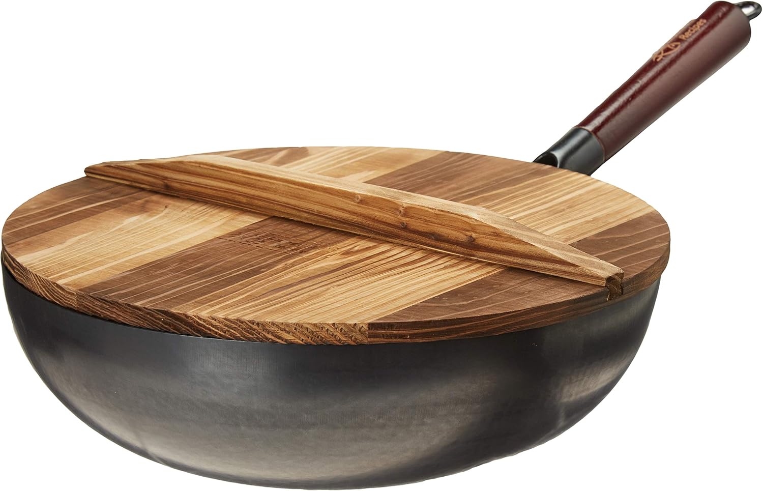 This wok set includes a 12.5-inch wok, a stainless steel spatula, a wooden lid, and a user guide.