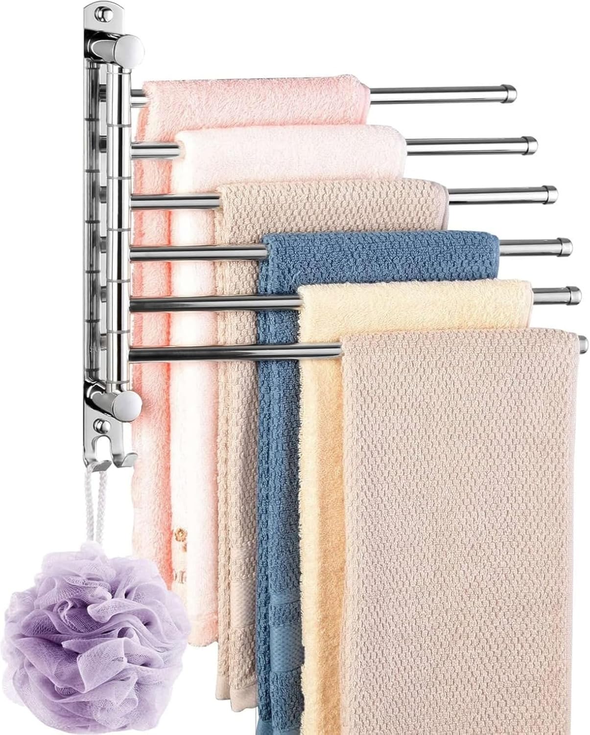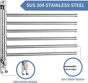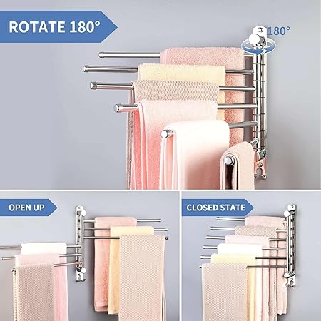 【MULTIFUNCTIONAL TOWEL RACK】This is a swivel towel rack features 6 extended length swing arms that can rotate 180°. Dry the towels in different layers, so that the towels can be keep away from moisture and more convenient and healthy, and there are two small hooks at the bottom, increase storage space to meet daily needs