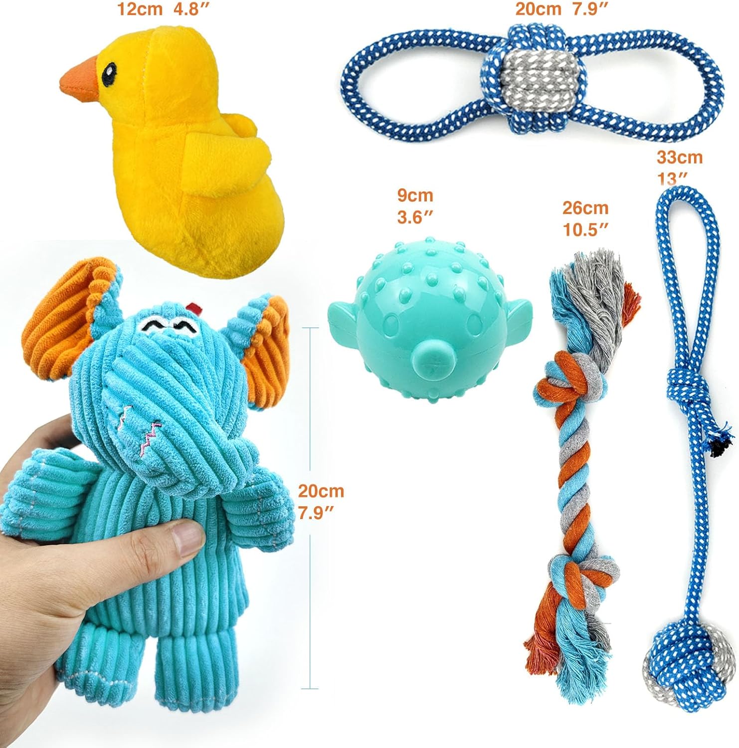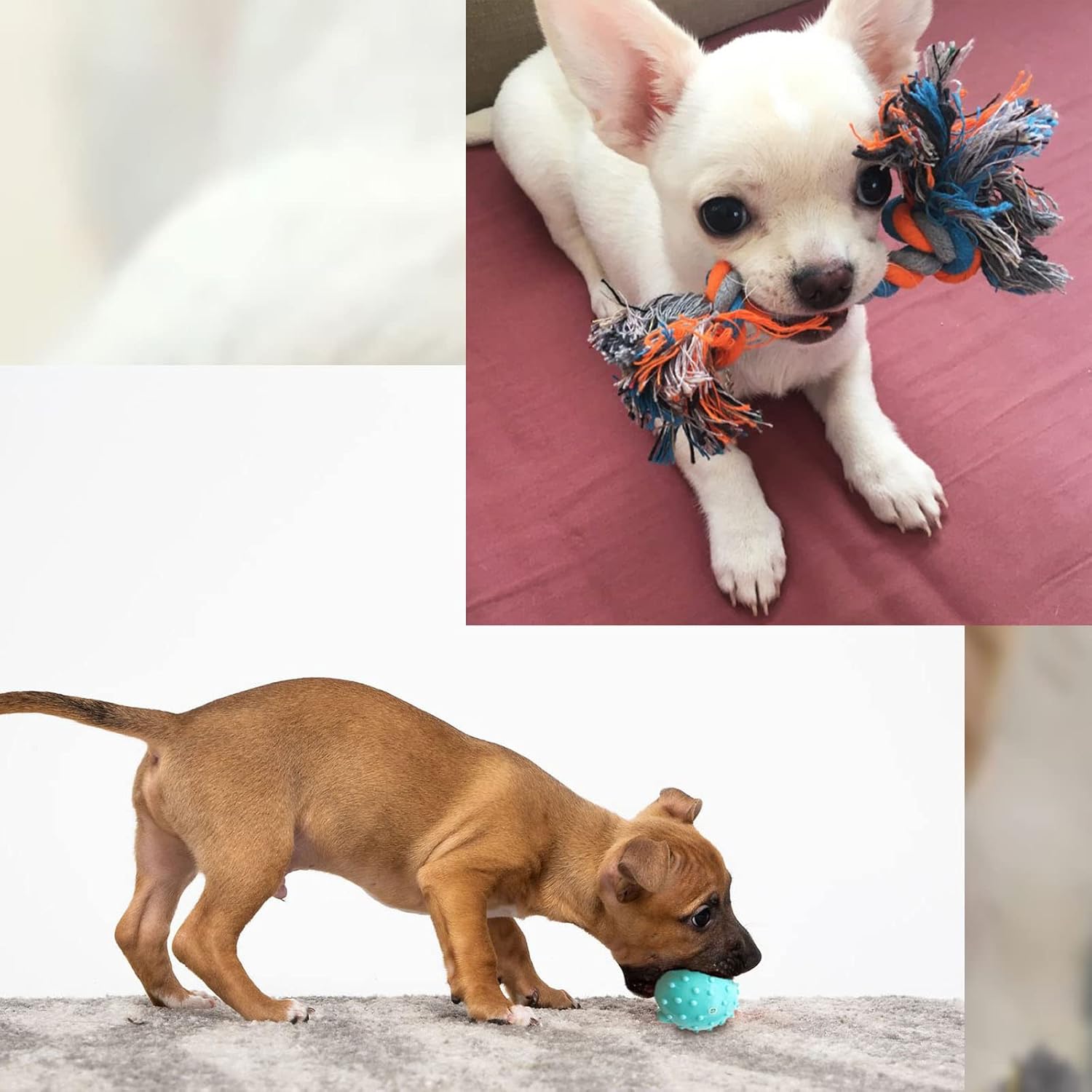 Diverse Play Options: Keep your puppy or small dog entertained with this versatile 6-piece toy set, offering a range of engaging options. From cuddly plush toys to interactive squeak balls and durable rope toys, there's something for every play style.