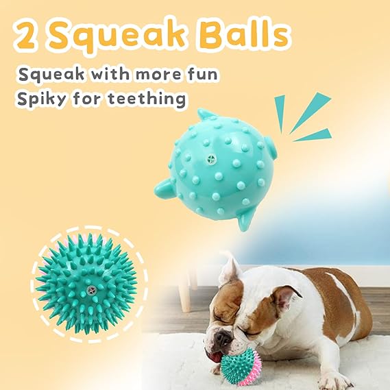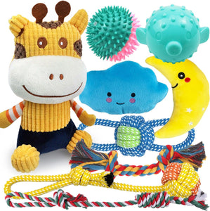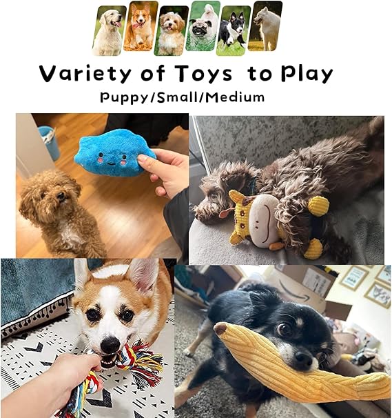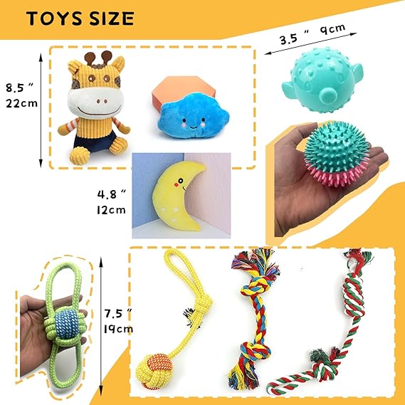 9 Pack Dog Toys Set Including lovely puppy squeaky toys , plush toys and various dog rope toys.These durable puppy toys are all favorite for dogs or puppies. Ideal for small and medium dogs to play interactive games and keeps your dog happy and busy
