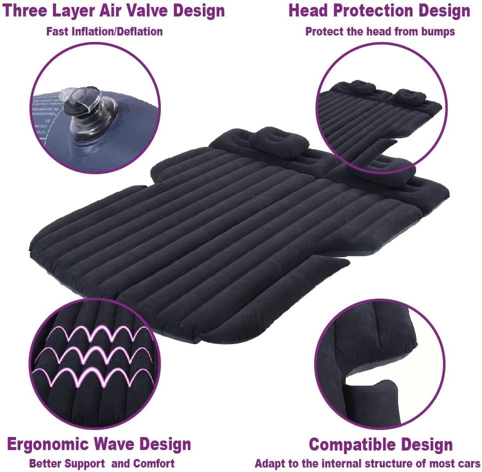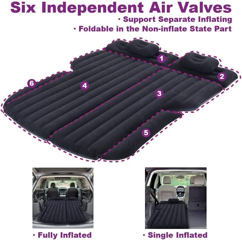 - Car Air Bed: Car Bed is made of thickened high quality PVC and Flocking,Skin-friendly and environmental protection.This SUV air mattress adopts 6 chambers design, which could improve the stability and could compatible for different model of the car better! The child's anti-drop design prevents your child from falling into the front row while driving.The vertical stripe design improves comfort makes people more comfortable.Long foot pier design,the stable support is like a real bed.