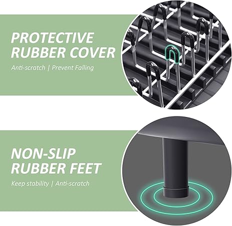 NON-SCRATCH & NON SLIP:The prongs of plate rack is covered with the protective cover, it prevents your items from scratch, falling and reduces the appearance of noise.The non-slip rubber feet keep the stability of the whole rack and will not scratch the countertop.